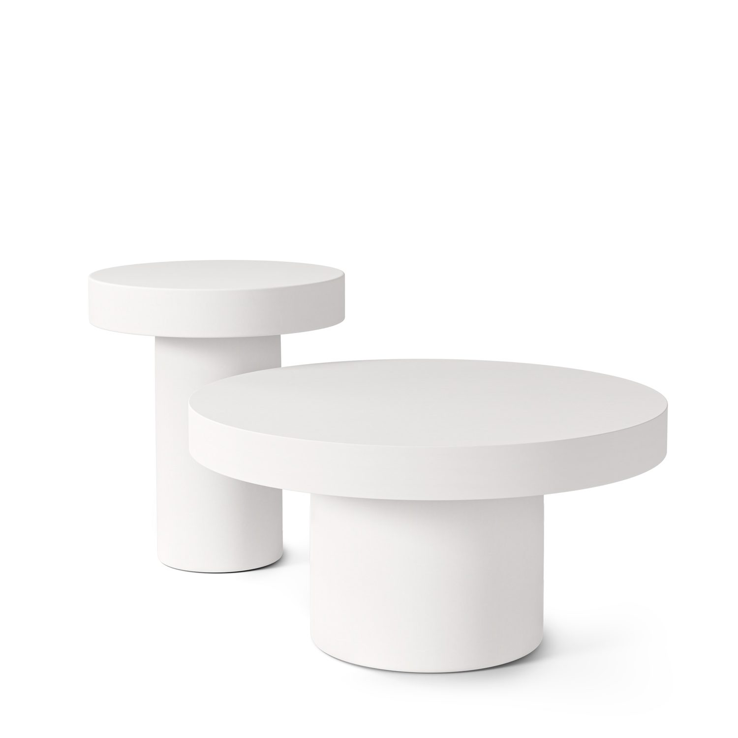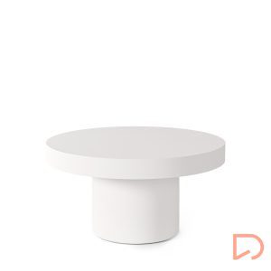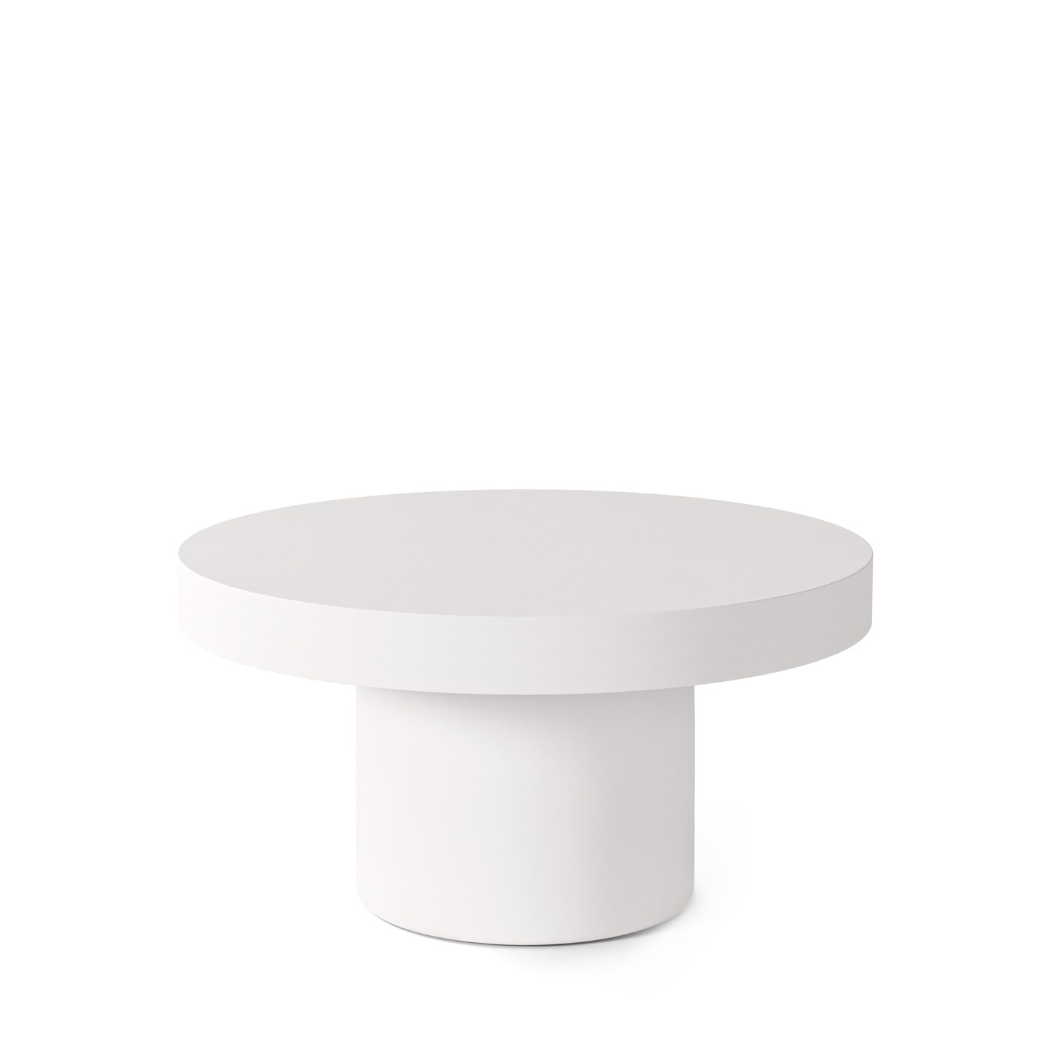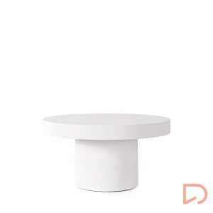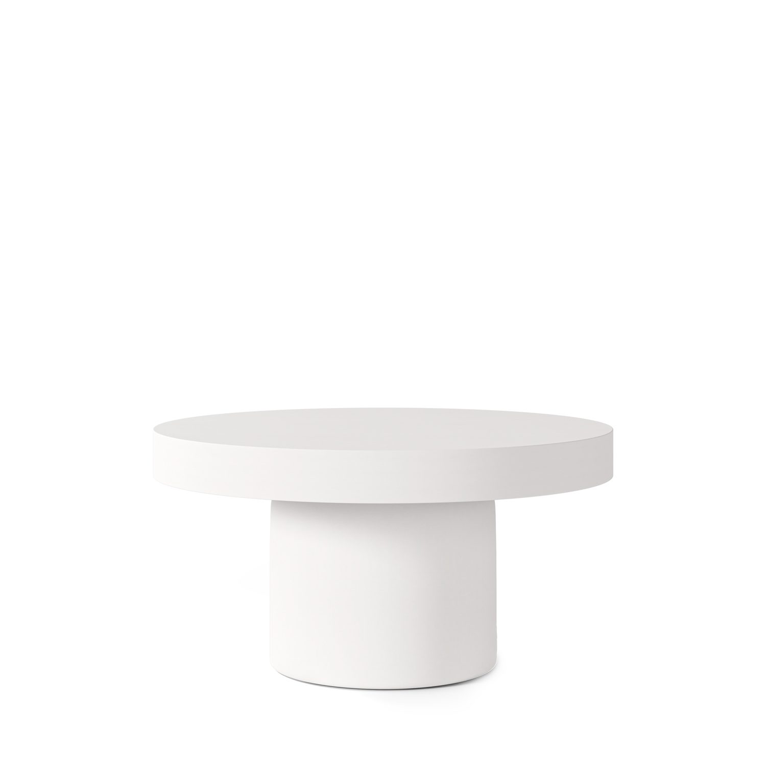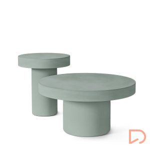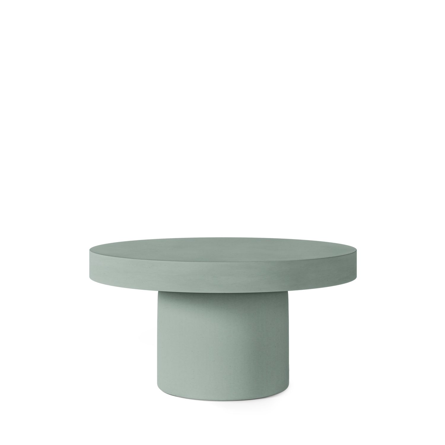 Con un diámetro de 80 cm y una altura de 40 cm, su diseño compacto pero rotundo destaca por la contundencia de su base cilíndrica y el grosor de 8 cm de su tapa, que aporta una sensación de solidez y presencia arquitectónica. La textura lisa del microcemento y su color neutro permiten integrarla fácilmente en diferentes ambientes, funcionando tanto como pieza central como complemento decorativo.