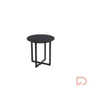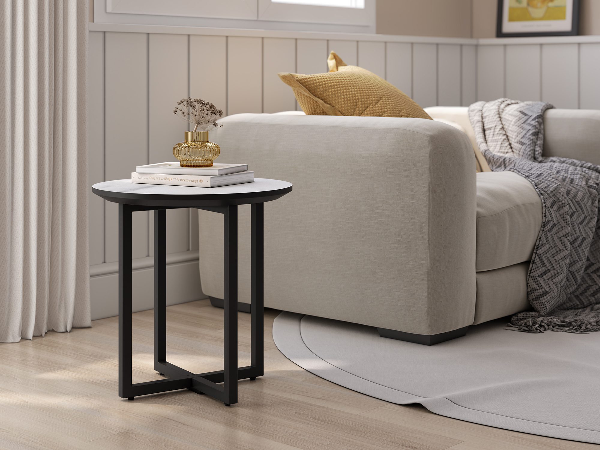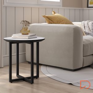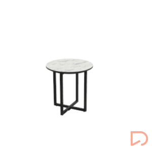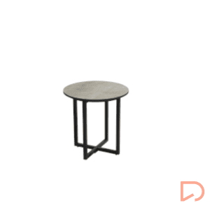 - Mesa auxiliar redonda con pata metálica negra y sobre laminado diseño piedras.