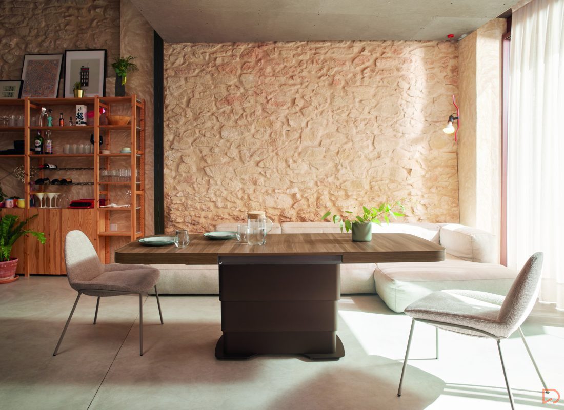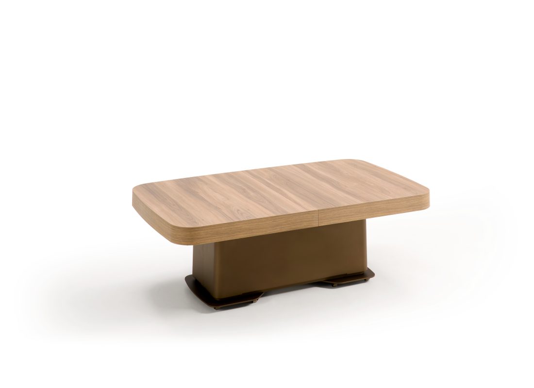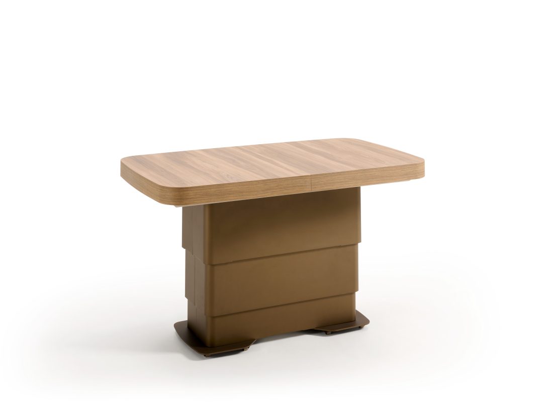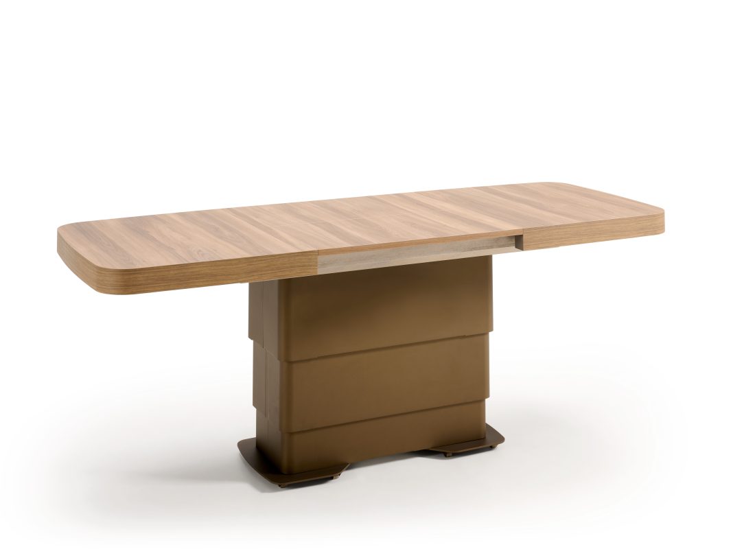 La mesa ELEGANT es una mesa multifuncional de centro convertible en mesa de comedor, con pie metálico y sobre extensible con canto redondo o recto y acabados en lacados, barnizado en chapa natural o laminados.