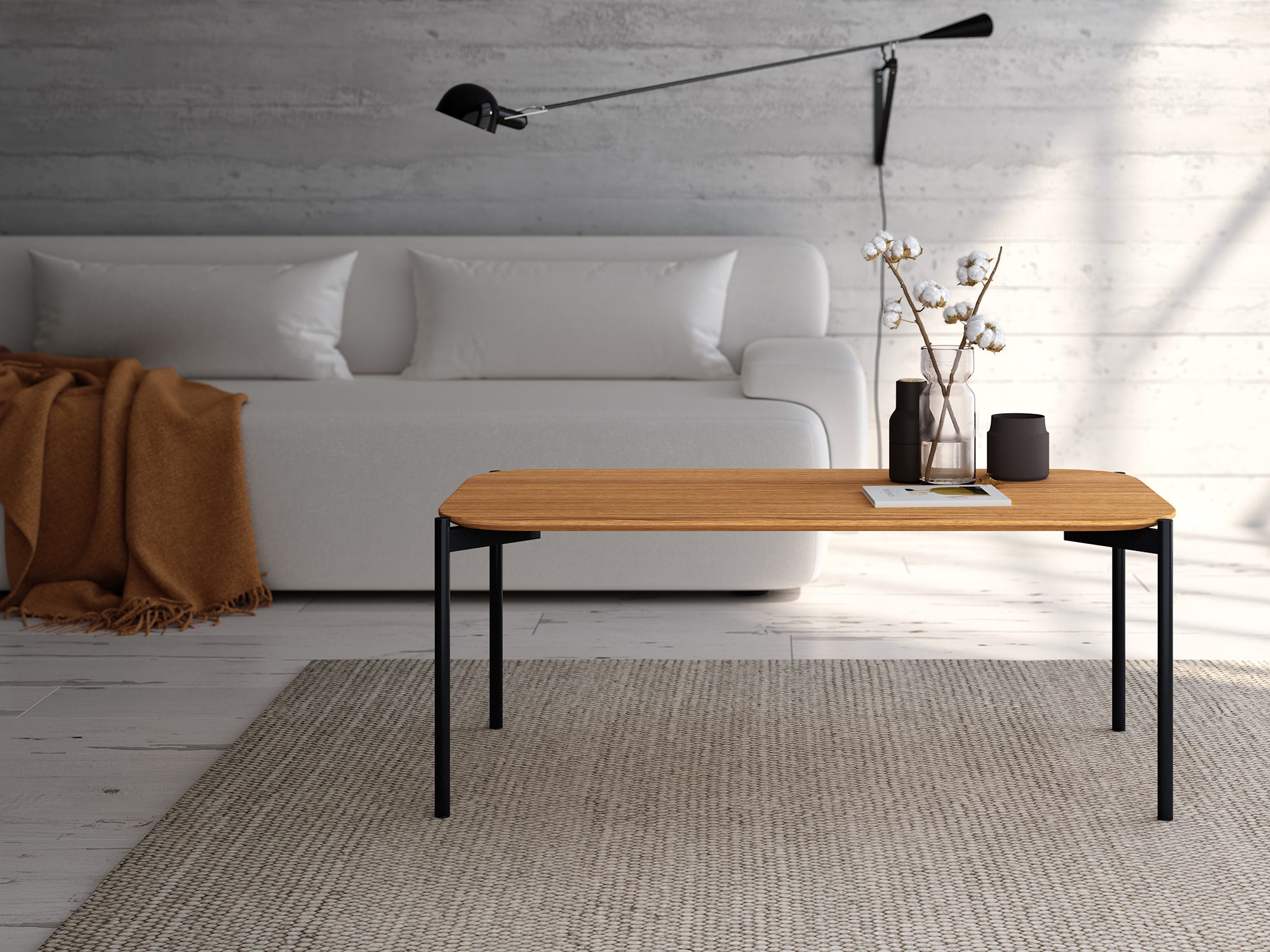 - Mesa auxiliar rectangular de madera de roble y patas metálicas negras.