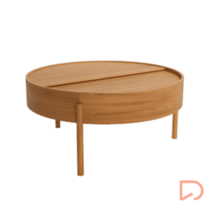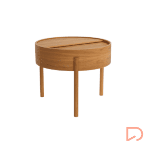 - Mesas auxiliares redondas de madera de roble, con sobre giratorio y compartimento oculto.