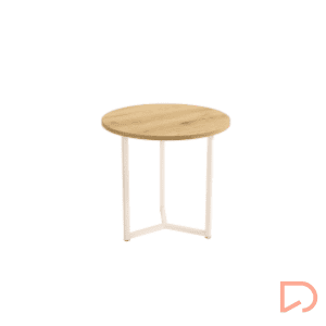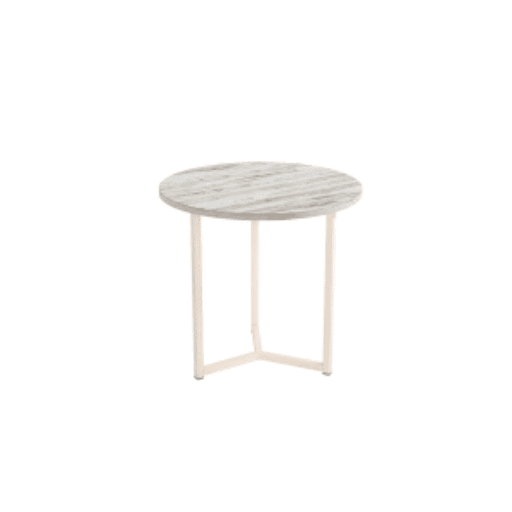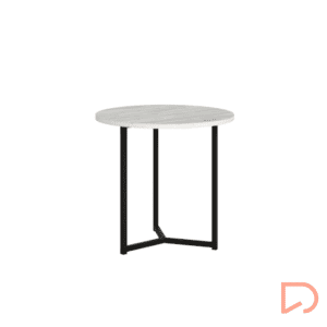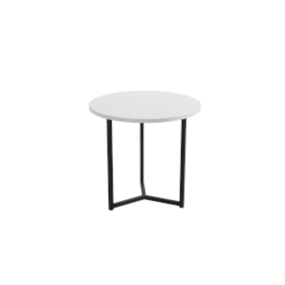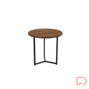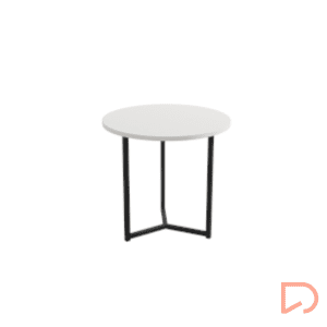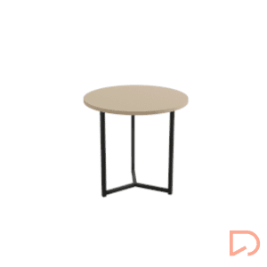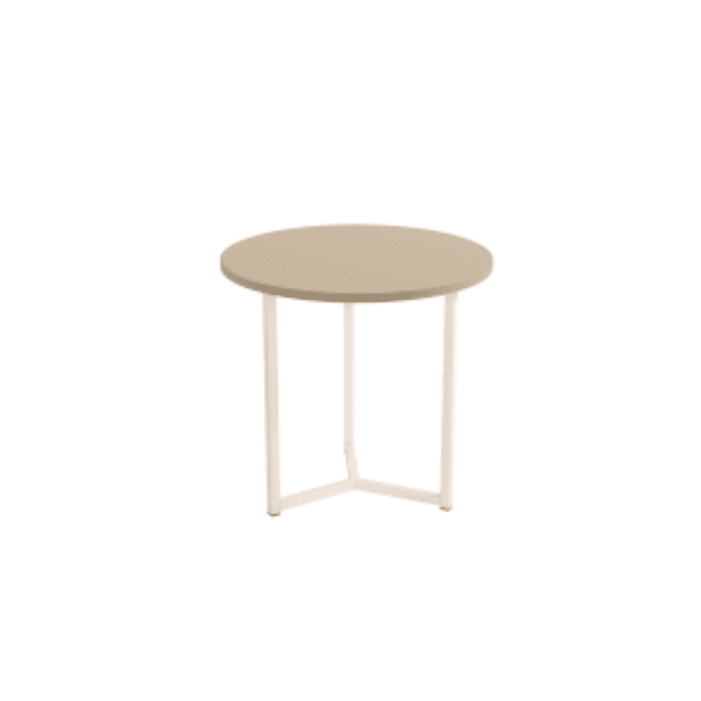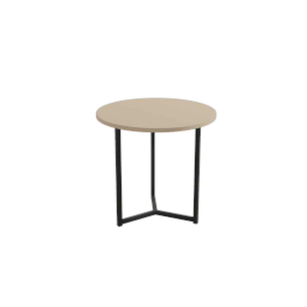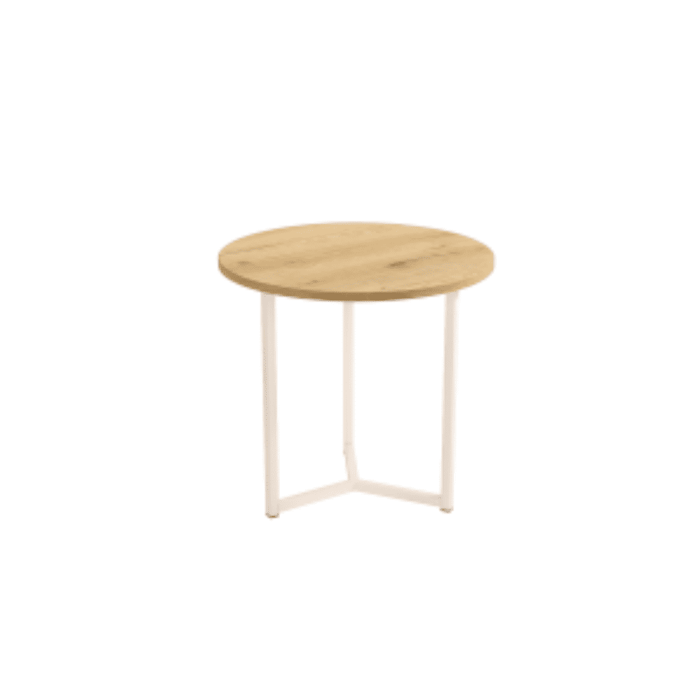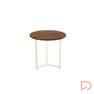- Mesa auxiliar redonda con pata metálica y sobre laminado.