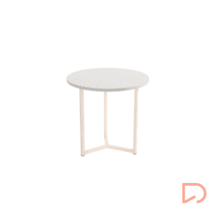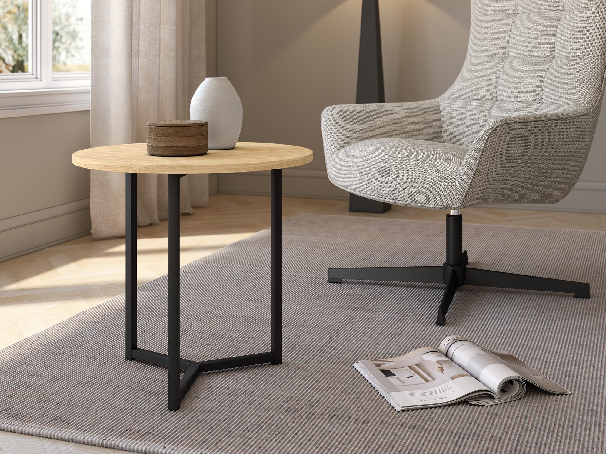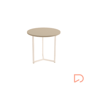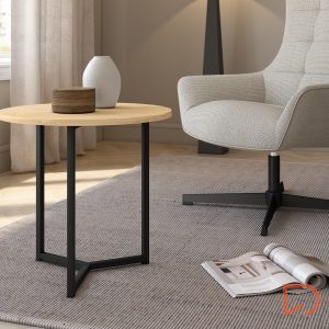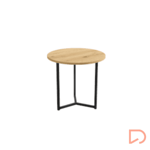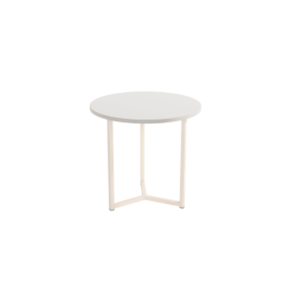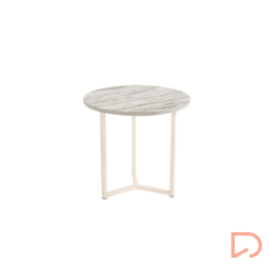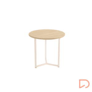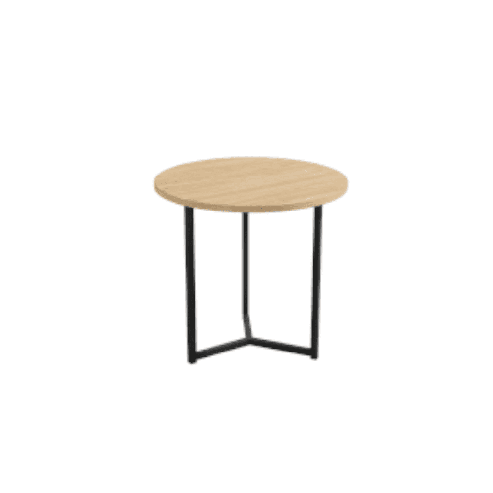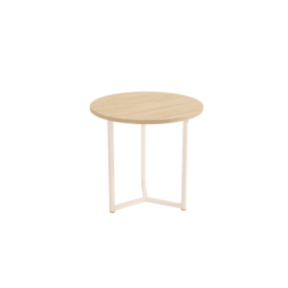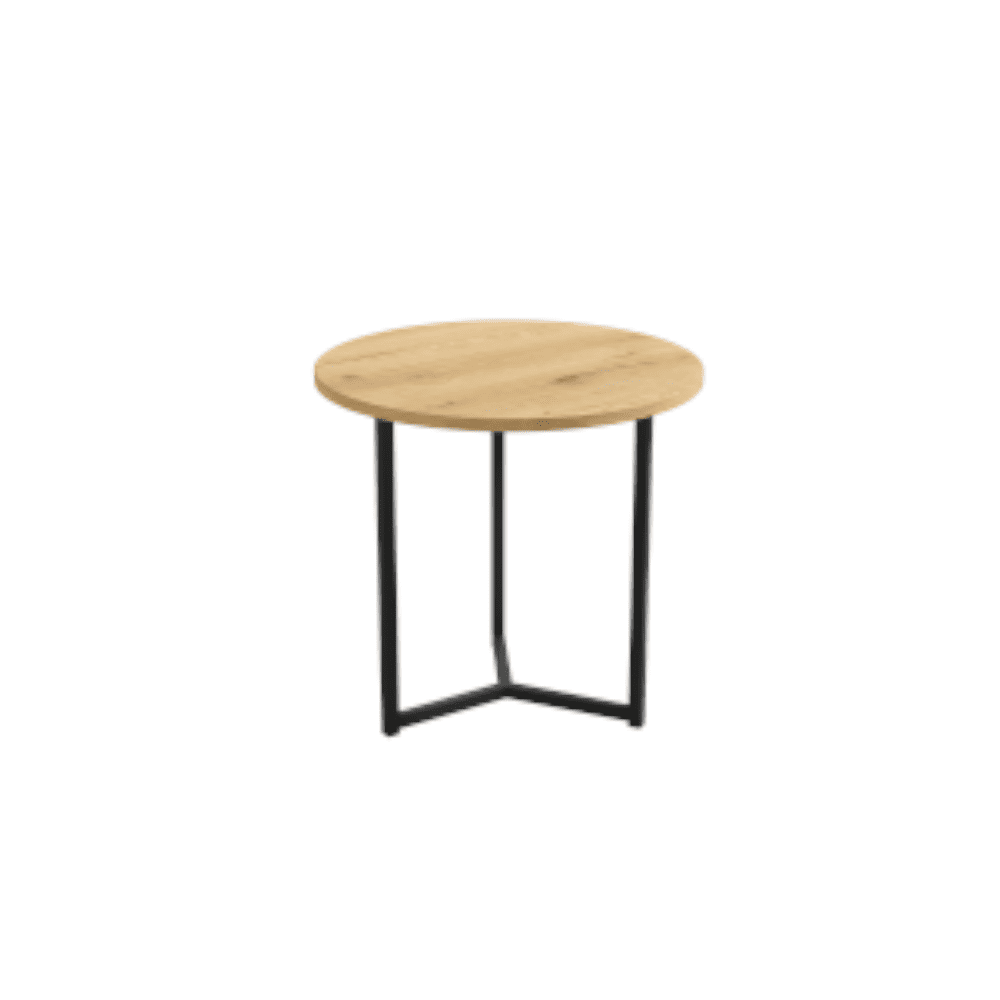 - Mesa auxiliar redonda con pata metálica y sobre laminado.