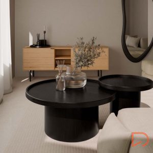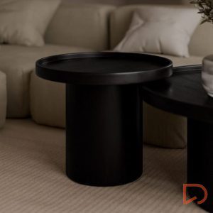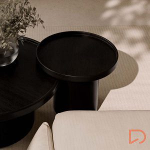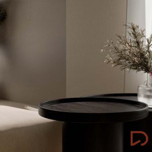 - Su superficie lisa y plana resalta la textura natural de la madera, aportando un toque de sofisticación. El diseño minimalista se completa con una base cilíndrica que proporciona estabilidad y un perfil estilizado.