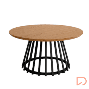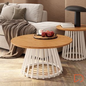 - Mesas auxiliares redondas de madera de roble, con sobre biselado de 25mm. y patas metálicas marfil o negro.