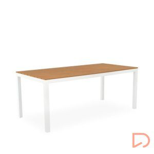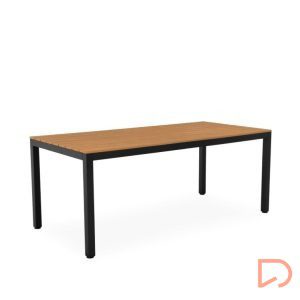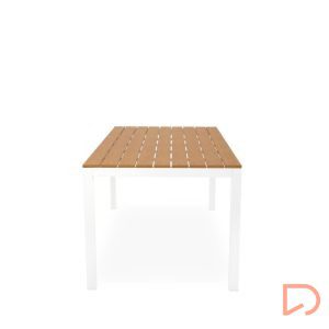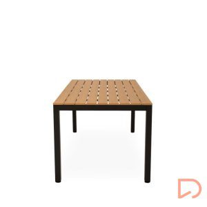 - Su tapa está compuesta por tablones de poli madera en acabado natural, que evocan la calidez de la madera pero con la ventaja de ser un material prácticamente libre de mantenimiento, resistente a la intemperie y fácil de limpiar.