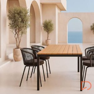 - La mesa de exterior CINTHIA es un mobiliario versátil y funcional que se convierte en el centro de reuniones al aire libre, combinando estética y confort en cada encuentro.