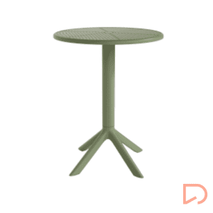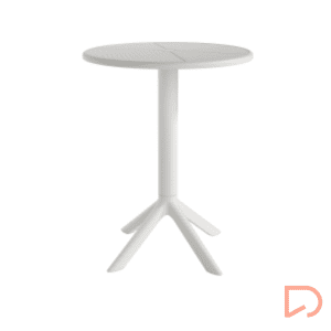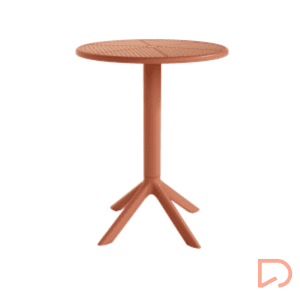- Mesa de terraza con estructura y sobre de polipropileno, apta para exteriores, disponible en varios acabados y tonos.