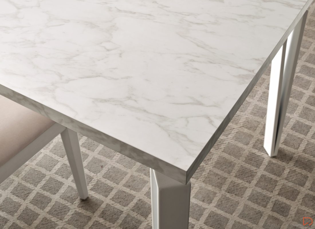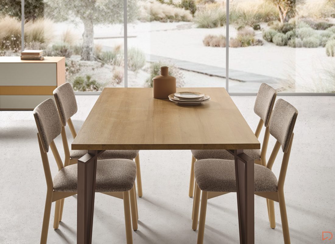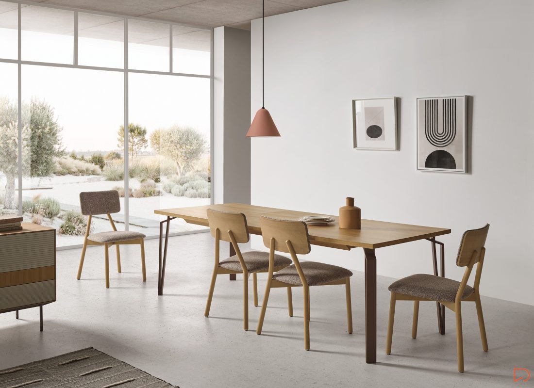 La mesa ARCO es una mesa de comedor fija o extensible, fabricación en acabados lacados, barnizado en chapa natural o laminados., con pata metálica.