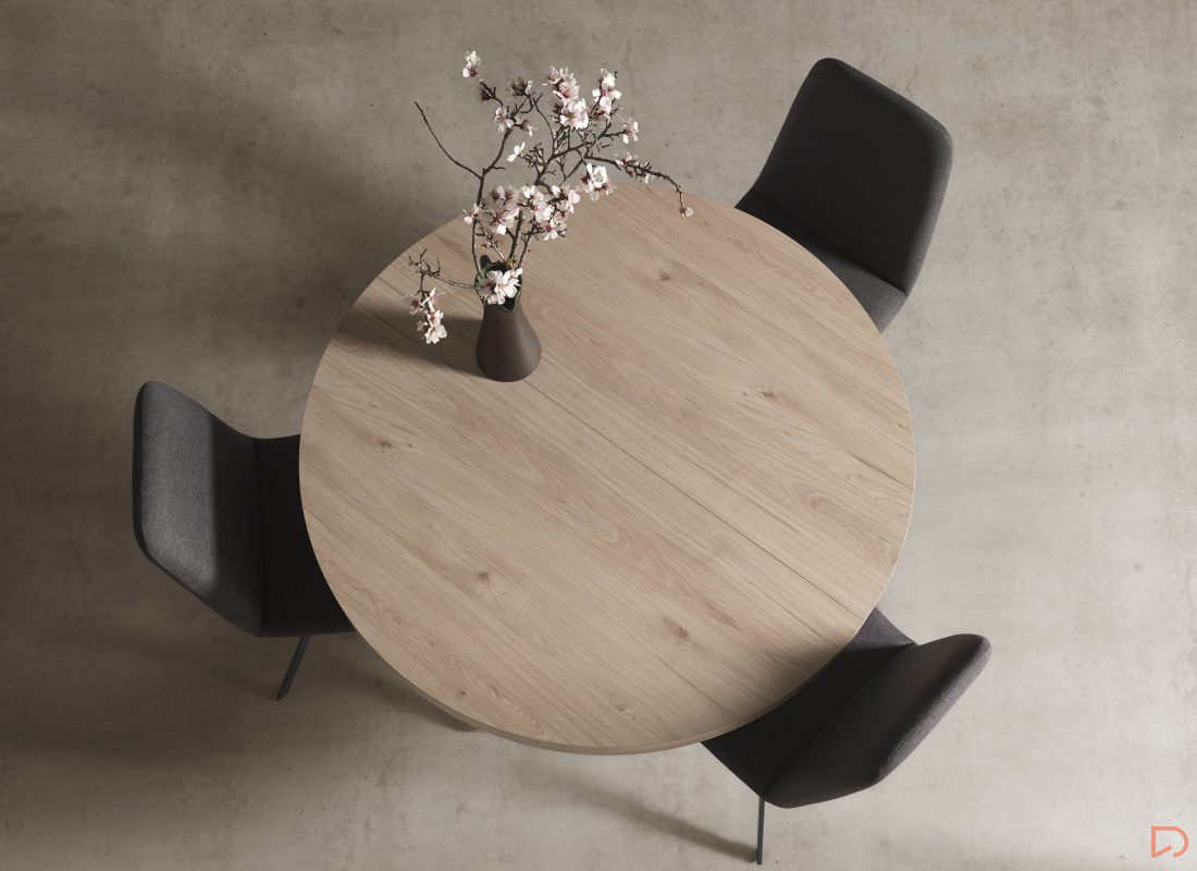 La mesa HIEDRA comedor con pie central metálico, con tapa de cristal redonda, tapa de madera barnizado en chapa natural o laminados en diferentes tonos y acabados a elegir., redonda o rectangular, fija o extensible.