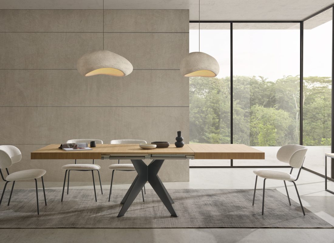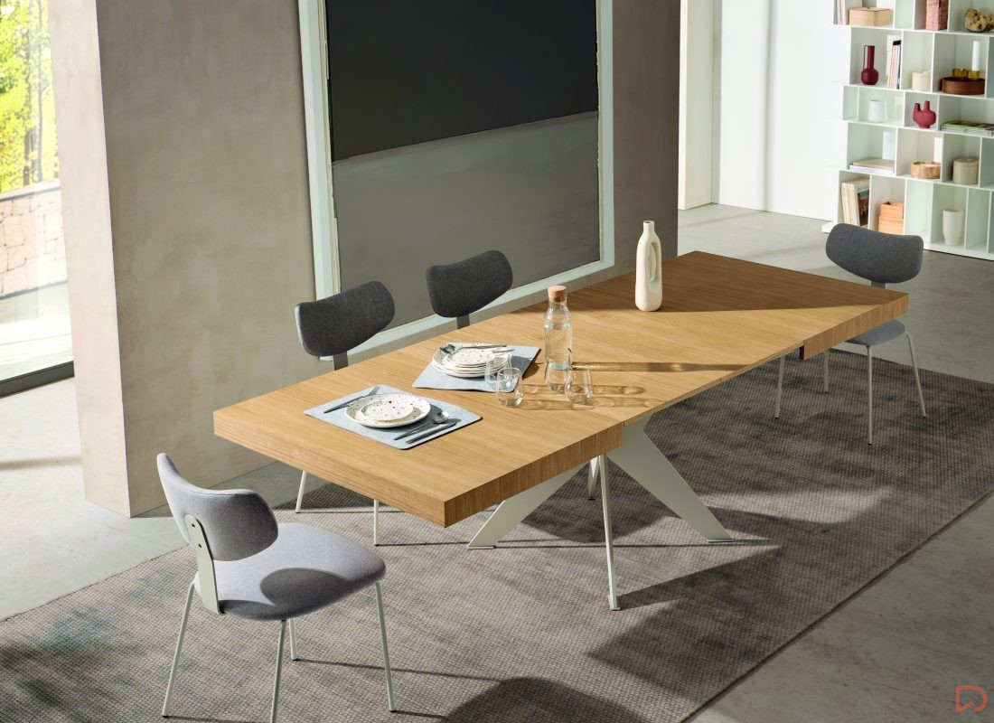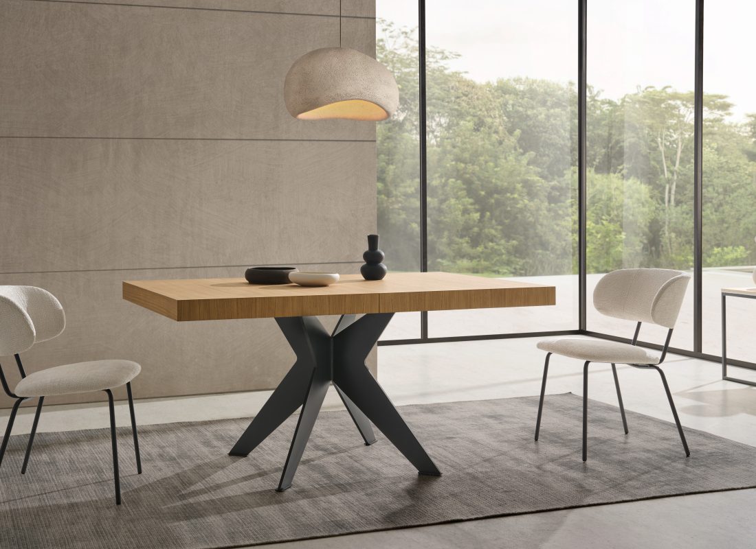 Mesa CONDOR, rectangular extensible fabricada en chapa de madera natural y pata metálica.