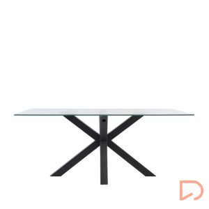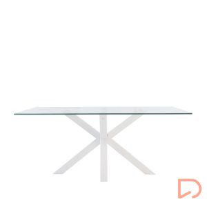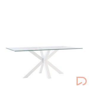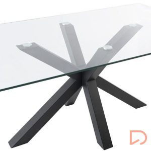 - Mesa fija DEMI con tapa de cristal templado de 12 mm de espesor y patas de metal en color negro o blanco que dotan mucha personalidad a la mesa gracias a su forma.