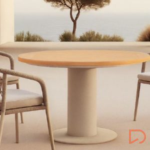 - La mesa de exterior ETHEL es una pieza que combina sofisticación y robustez en un diseño circular que invita a la convivencia y al disfrute al aire libre. Su tapa de polimadera en acabado natural evoca la calidez de la madera, aportando un toque orgánico sin comprometer la durabilidad, ideal para exteriores.
