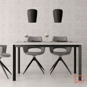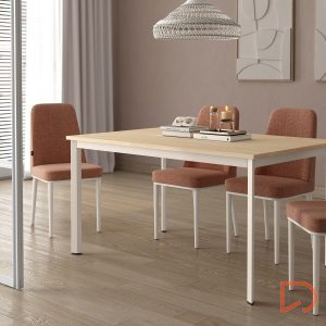 - Mesa en acabados imitación a madera, disponible en tonos: alpin, java, perla, artic, roble o soul blanco, patas de metal en acabados negro o marfil creando una estructura artística y estable.