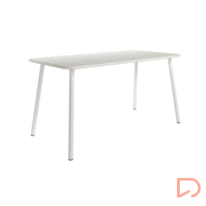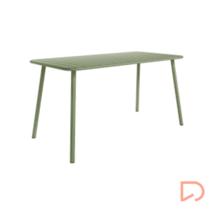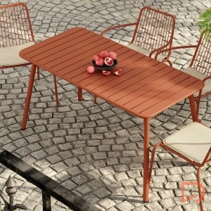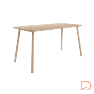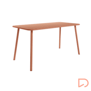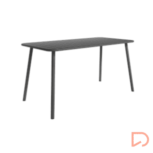 - Mesa de terraza con estructura y sobre de lamas metálico, apta para exteriores, disponible en varios acabados y tonos.