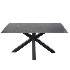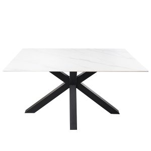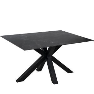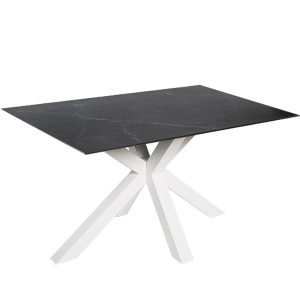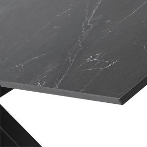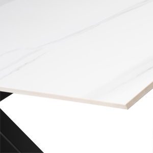 - Esta mesa cuenta con una tapa porcelánica que incluye una capa de cristal templado, lo que la hace resistente y fácil de limpiar, además de tener un acabado que imita el mármol, aportando un toque de sofisticación y lujo.