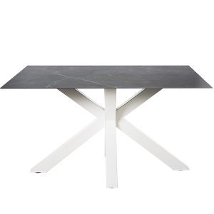 - Mesa disponible en tonos gris, negro y blanco y patas de metal que se entrecruzan, en acabados negro y blanco, creando una estructura artística y estable.