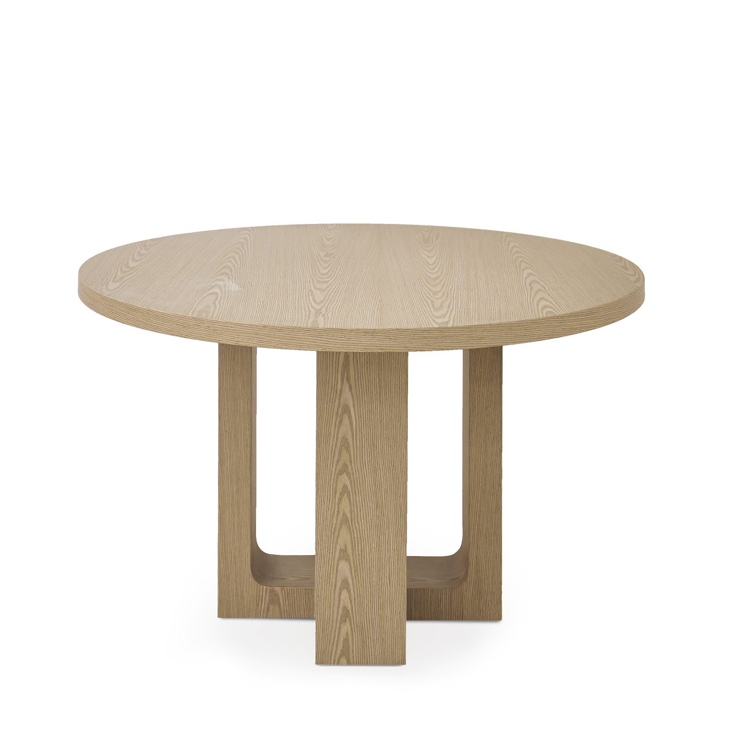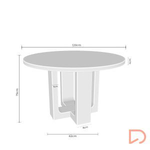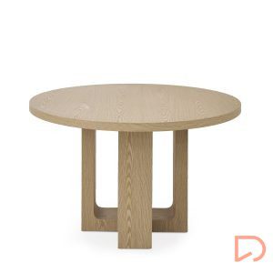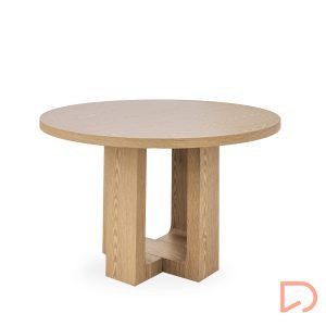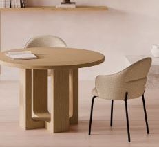 La mesa MAXINE Ø120 cm destaca por su elegante diseño y su impactante pata central de chapa de madera, que aporta un toque escultórico y moderno al conjunto. La tapa redonda, también en chapa de madera y con 4 cm de grosor, realza la calidez natural del material y transmite solidez.