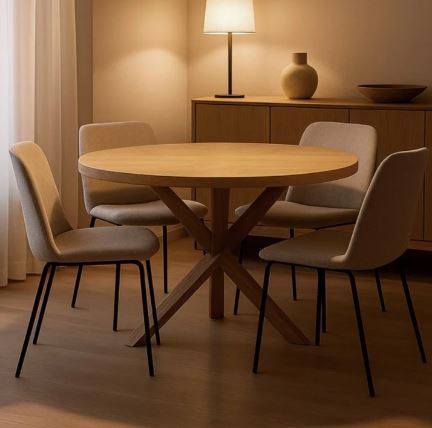 - Fabricada con chapa de roble y complementada con patas de madera maciza, esta mesa destaca por su estructura robusta que garantiza una durabilidad excepcional y una estabilidad superior.