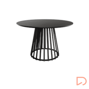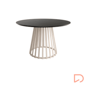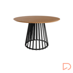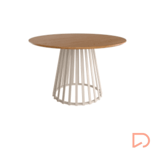 - Mesa en acabados de madera, disponible en tonos roble natural y roble negro, con patas en tono negro o marfil, creando una estructura artística y estable.