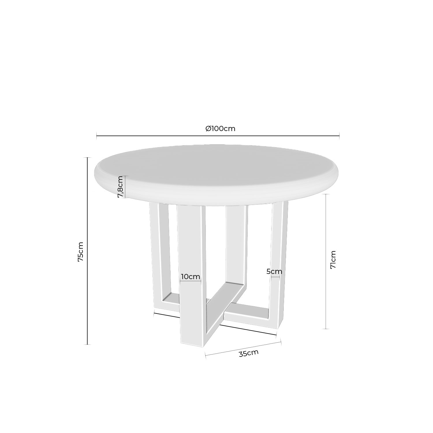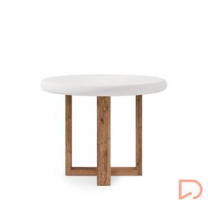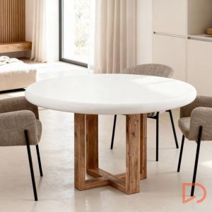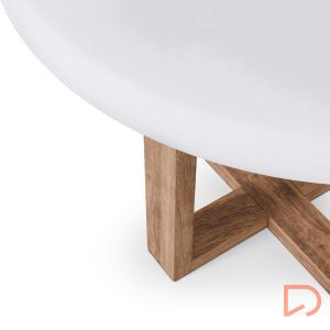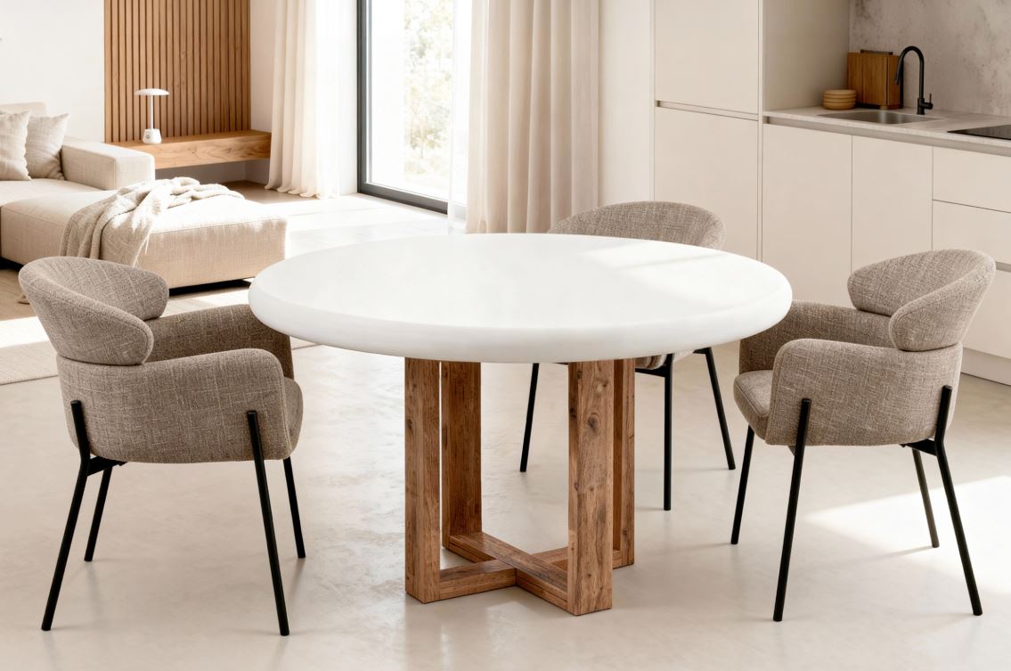 Su tapa de cemento-GFRC blanco (reforzado con fibra de vidrio) ofrece una textura suave y moderna, con un acabado resistente y fácil de mantener, ideal para el uso diario. Este material aporta un toque industrial sutil, que contrasta armoniosamente con la calidez de la base.