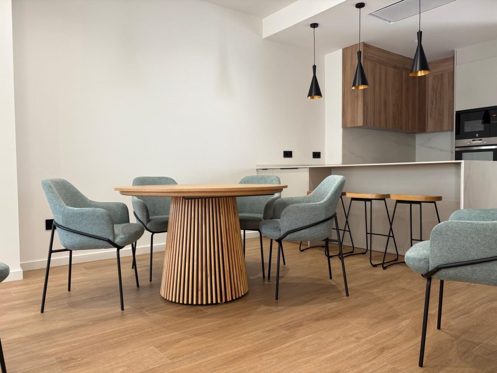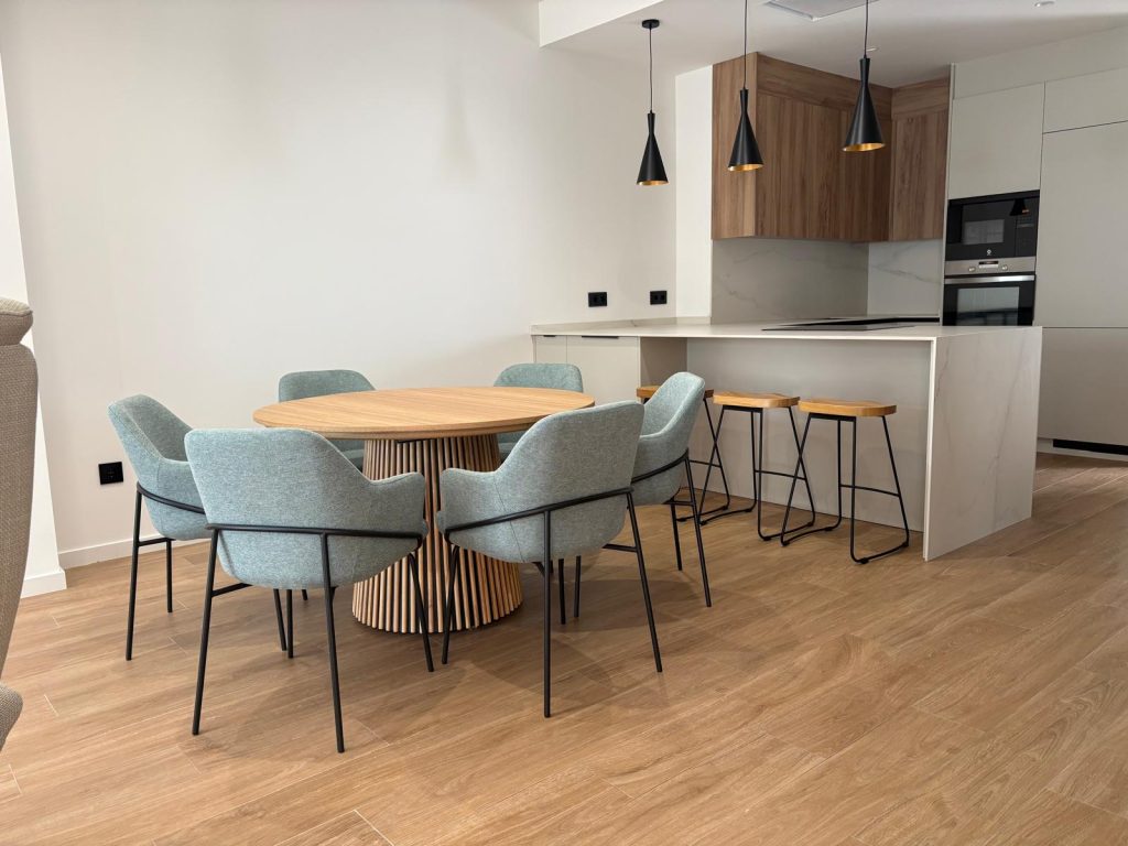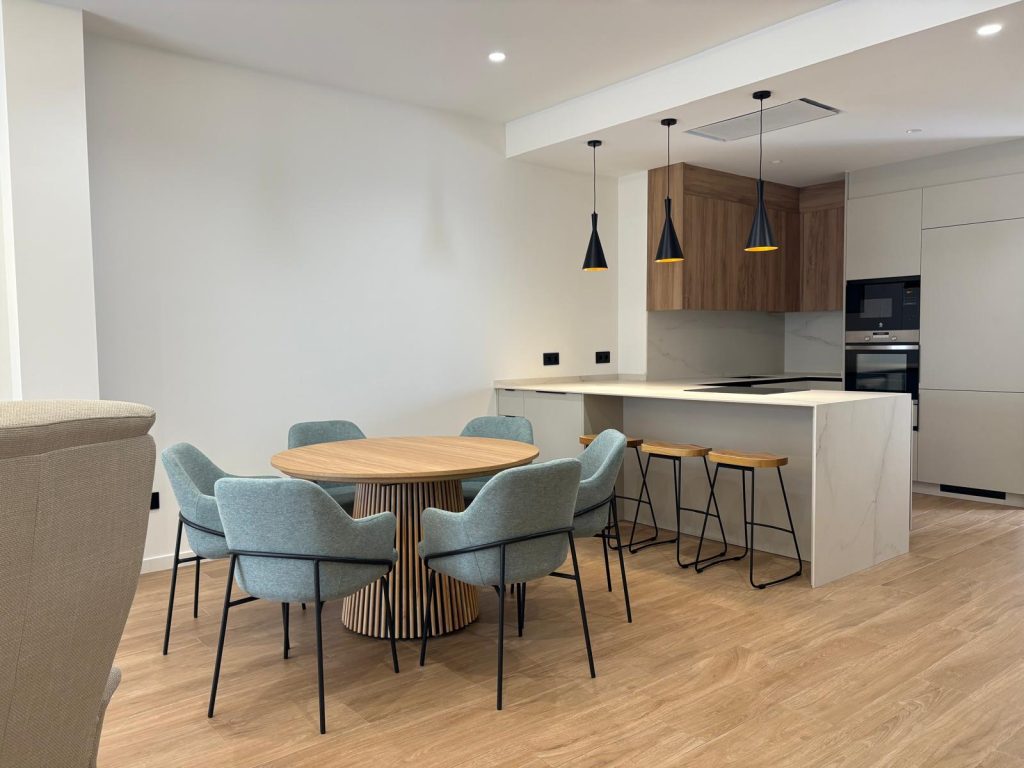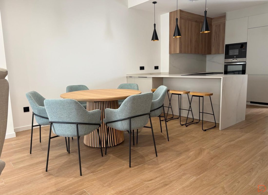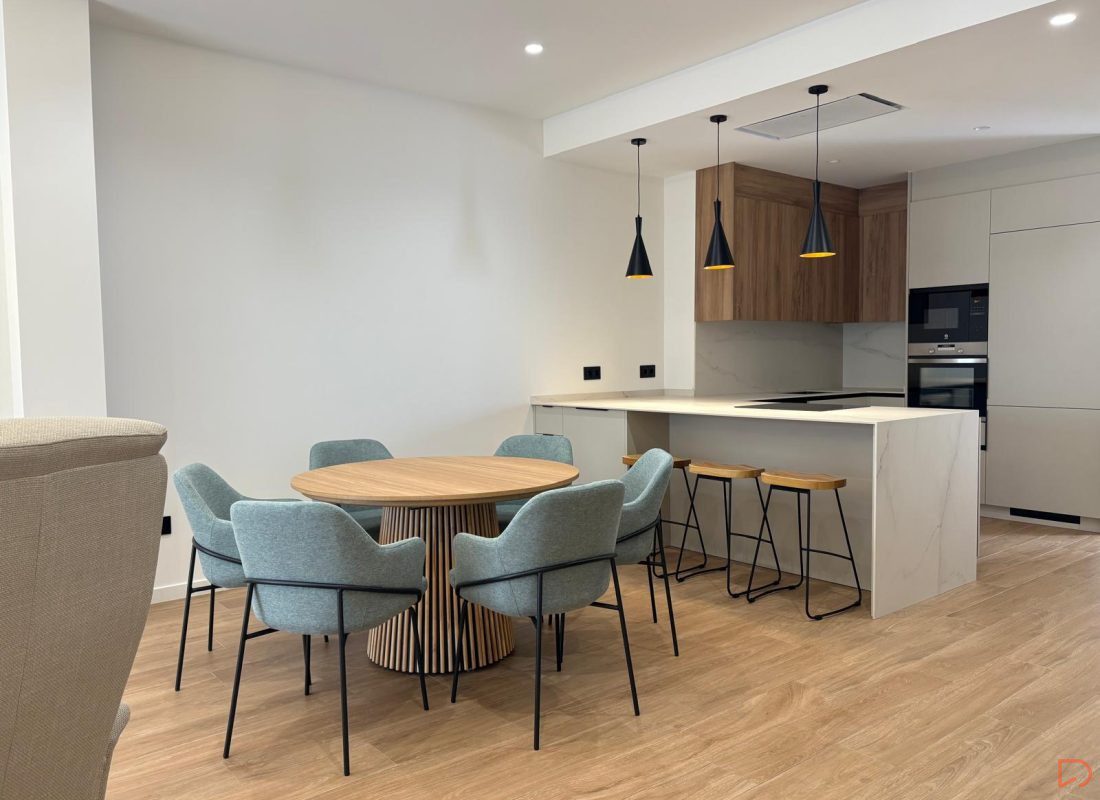 Conjunto de salón-cocina de estilo moderno y elegante, con mobiliario de líneas limpias en tonos neutros y madera, iluminación LED integrada en techo y muebles, y cocina con isla y barra volada con taburetes, creando un espacio luminoso, funcional y contemporáneo.