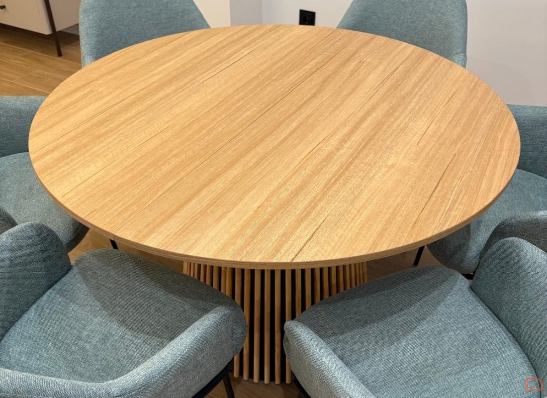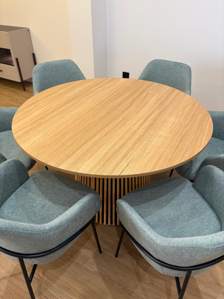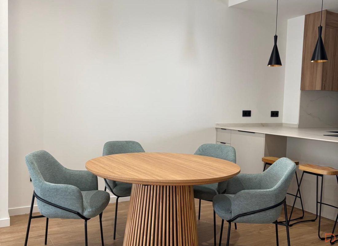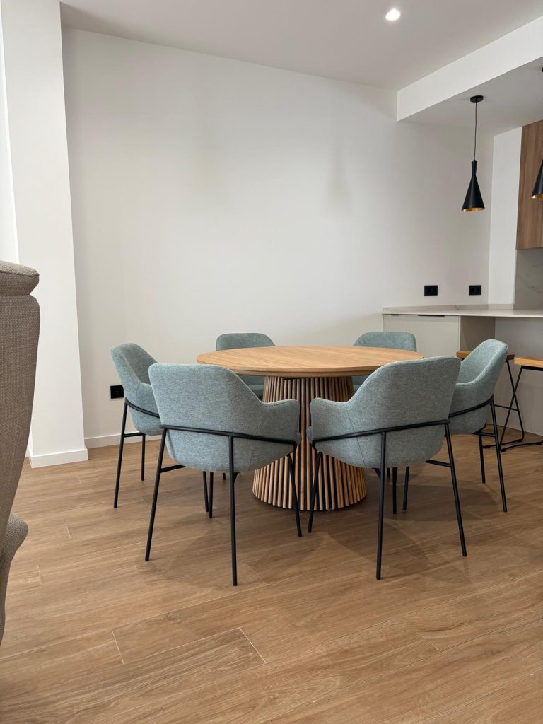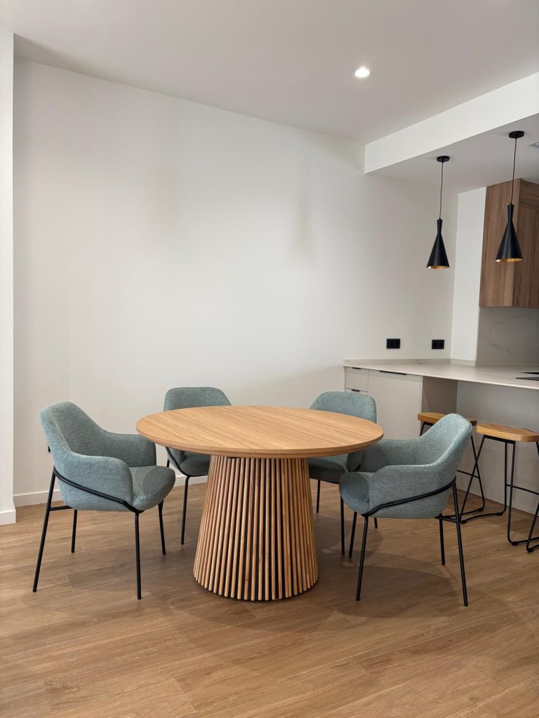 Conjunto de salón-cocina de estilo moderno y elegante, con mobiliario de líneas limpias en tonos neutros y madera, iluminación LED integrada en techo y muebles, y cocina con isla y barra volada con taburetes, creando un espacio luminoso, funcional y contemporáneo.