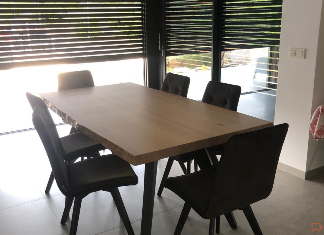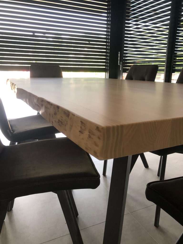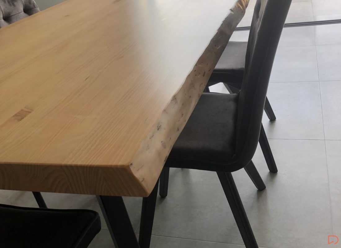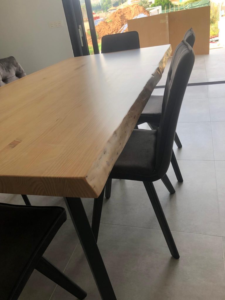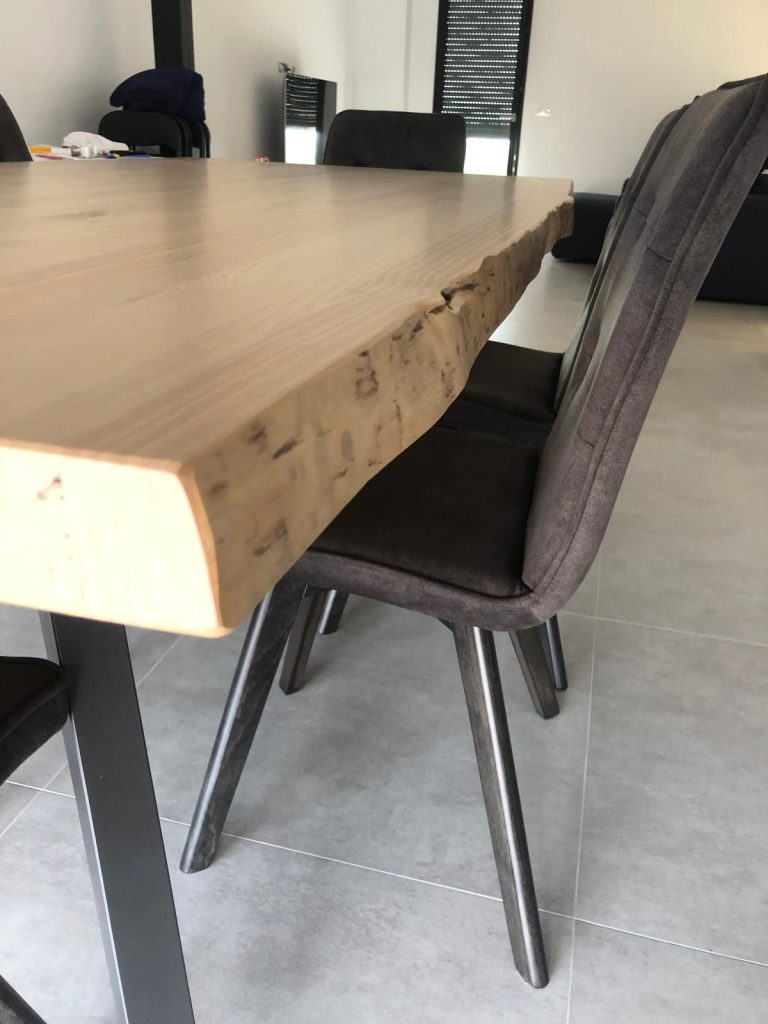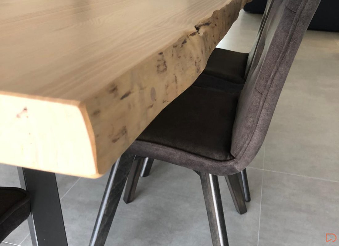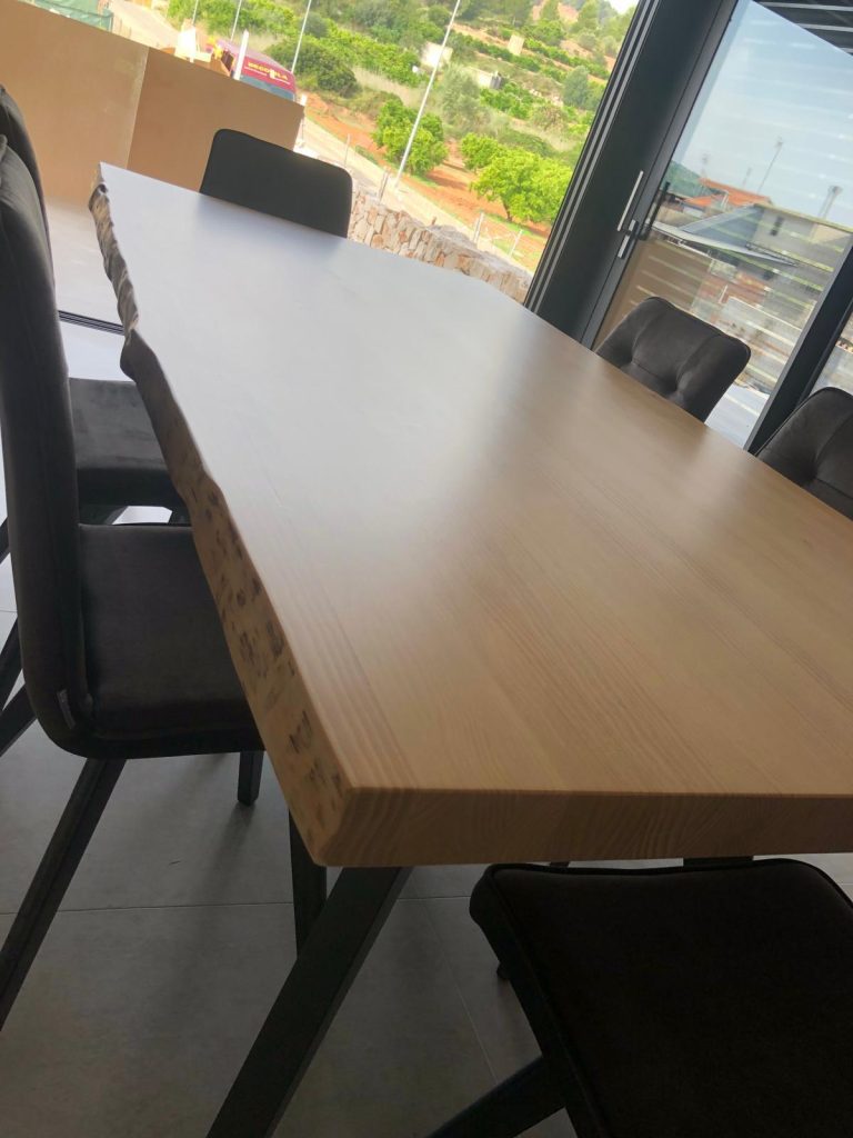 Este conjunto de comedor se caracteriza por un estilo moderno y sobrio, ideal para espacios luminosos y contemporáneos. La mesa rectangular de madera maciza con bordes irregulares conserva un atractivo aspecto natural, aportando calidez y carácter al ambiente. Su base de patas metálicas en color negro proporciona firmeza y un contraste elegante con el sobre de madera.