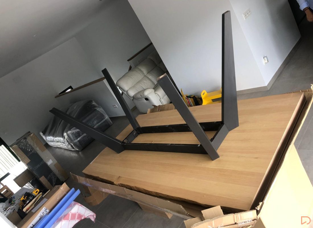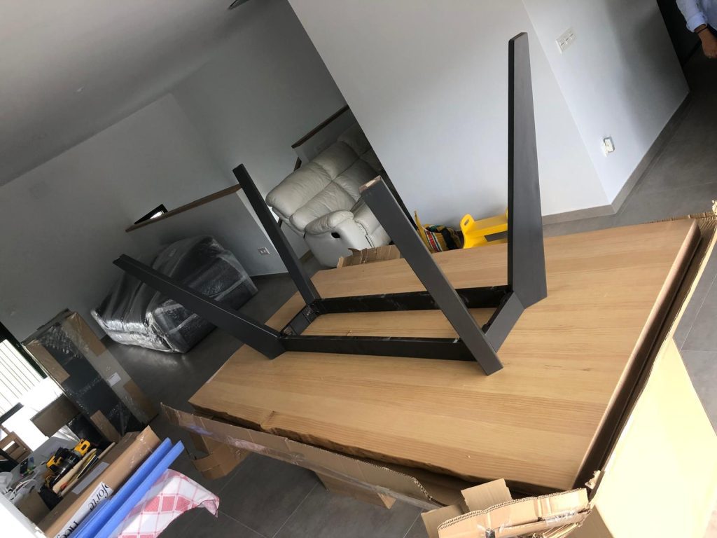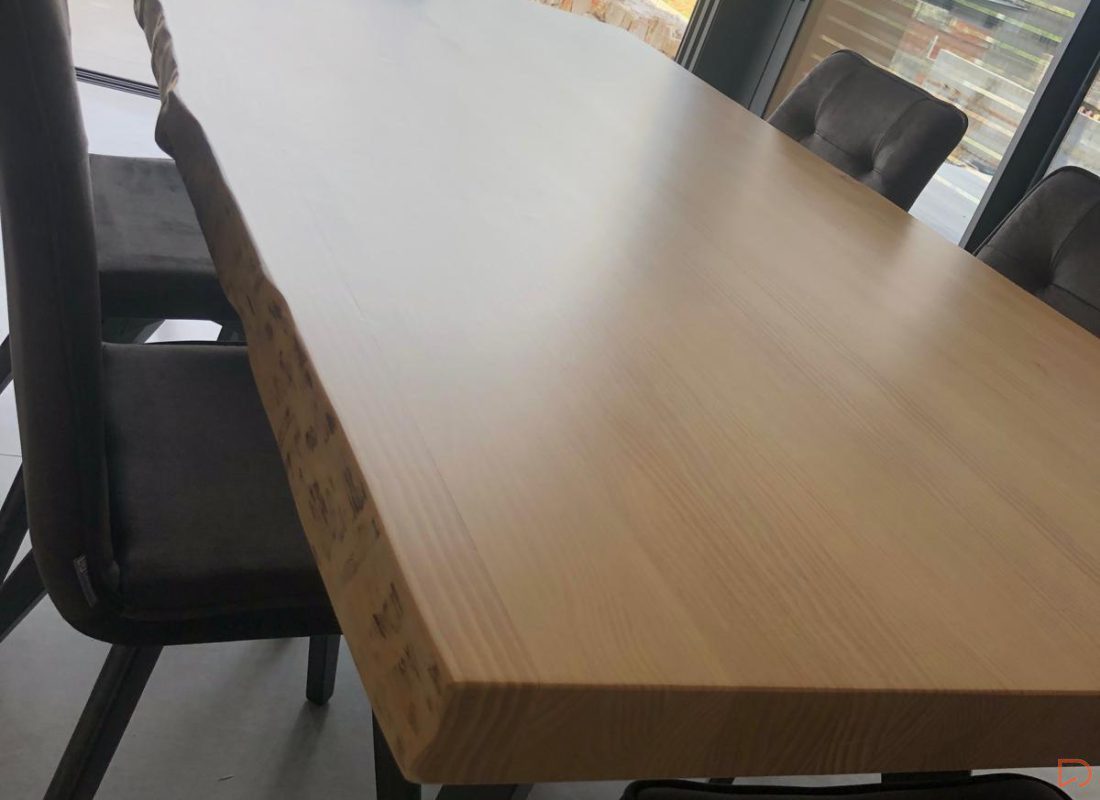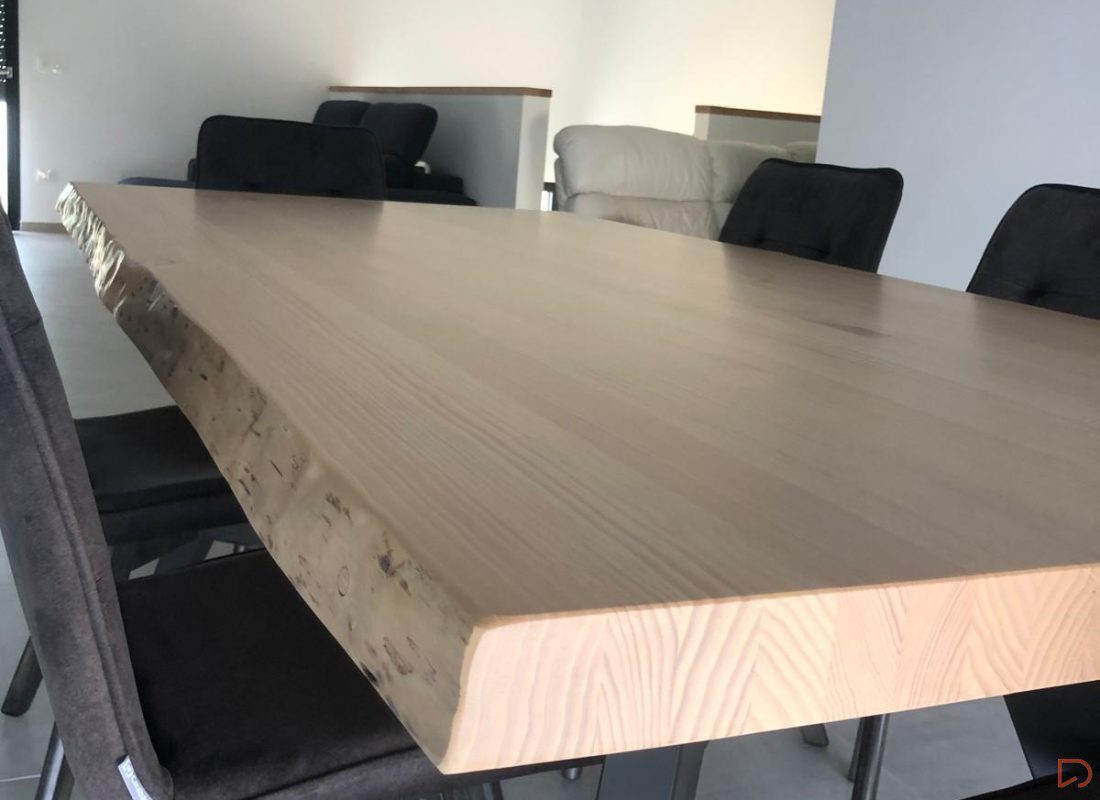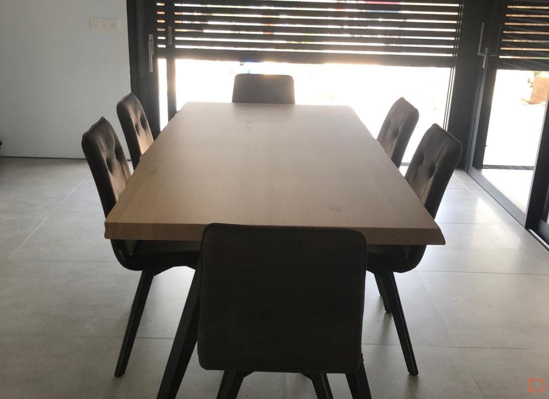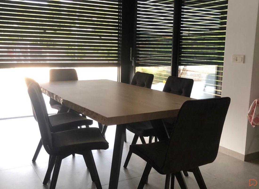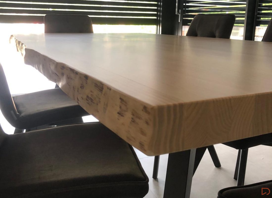 Este conjunto de comedor se caracteriza por un estilo moderno y sobrio, ideal para espacios luminosos y contemporáneos. La mesa rectangular de madera maciza con bordes irregulares conserva un atractivo aspecto natural, aportando calidez y carácter al ambiente. Su base de patas metálicas en color negro proporciona firmeza y un contraste elegante con el sobre de madera.