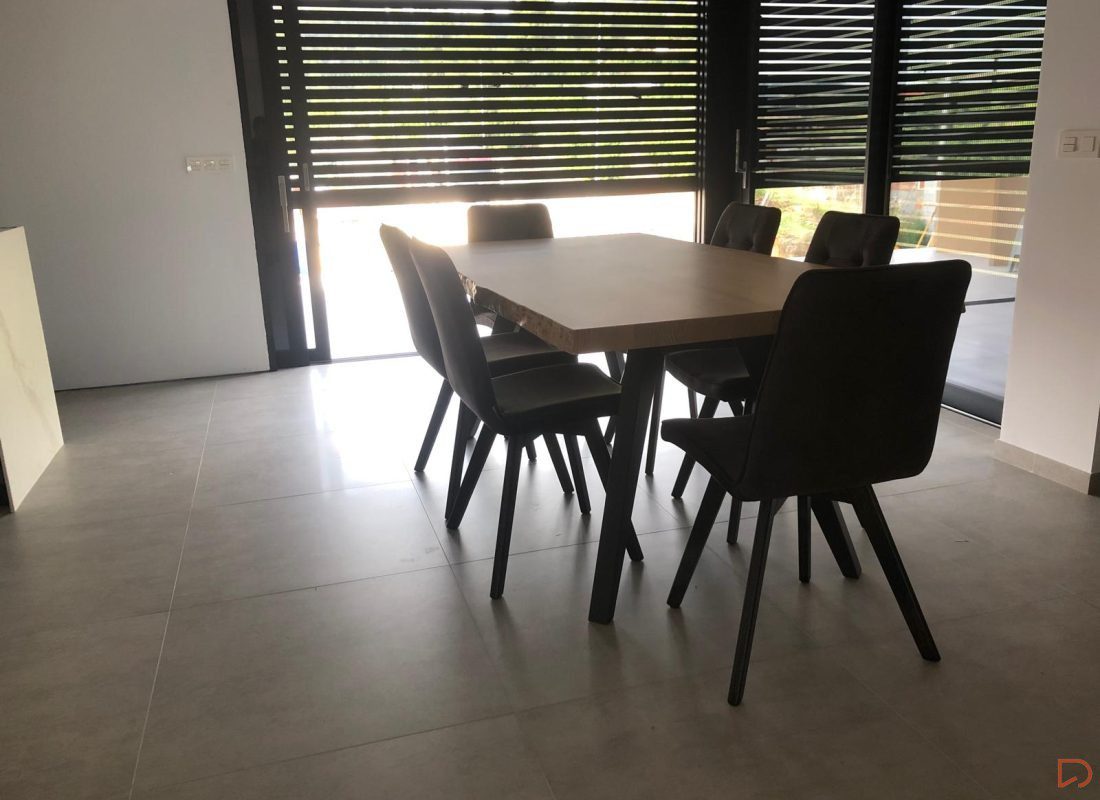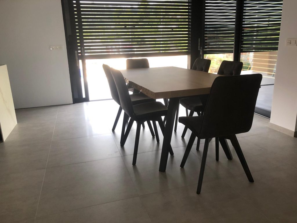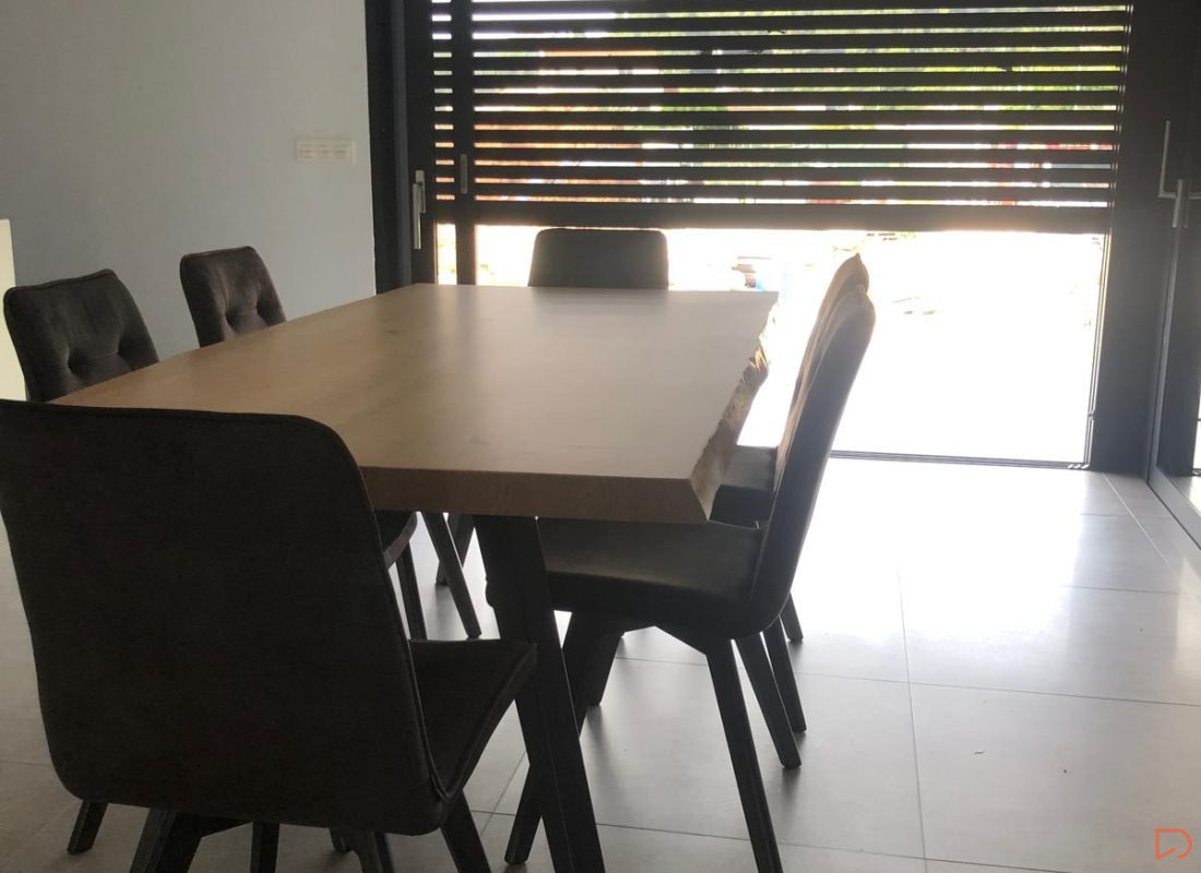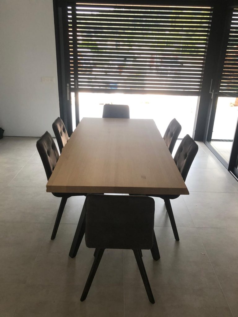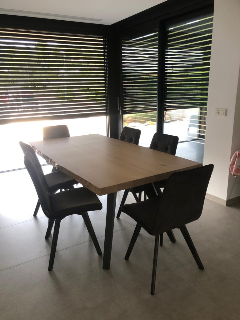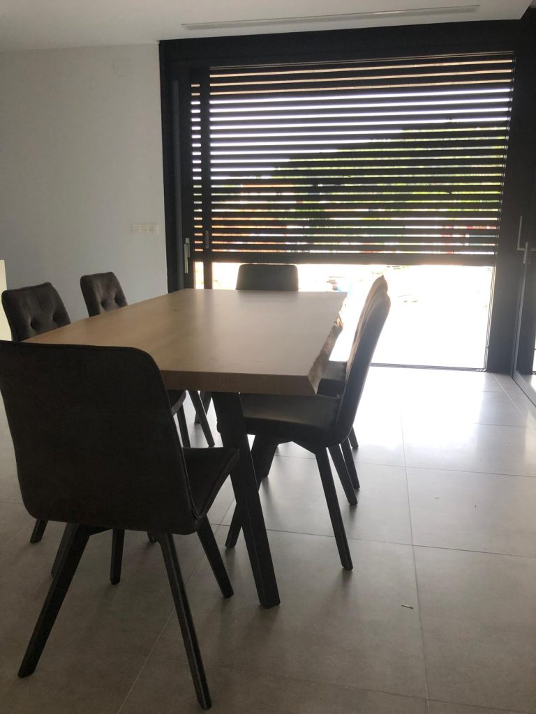 Las seis sillas que acompañan la mesa cuentan con un diseño ergonómico, respaldo ligeramente curvado y tapizado oscuro, lo que les confiere comodidad y un aire sofisticado. El conjunto se integra perfectamente en un entorno con grandes ventanales y persianas venecianas, aprovechando la luz natural y creando un espacio acogedor para comidas y reuniones.