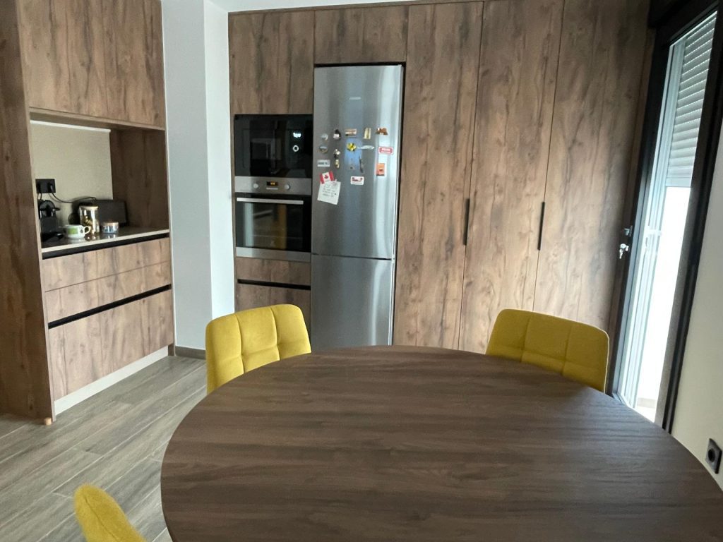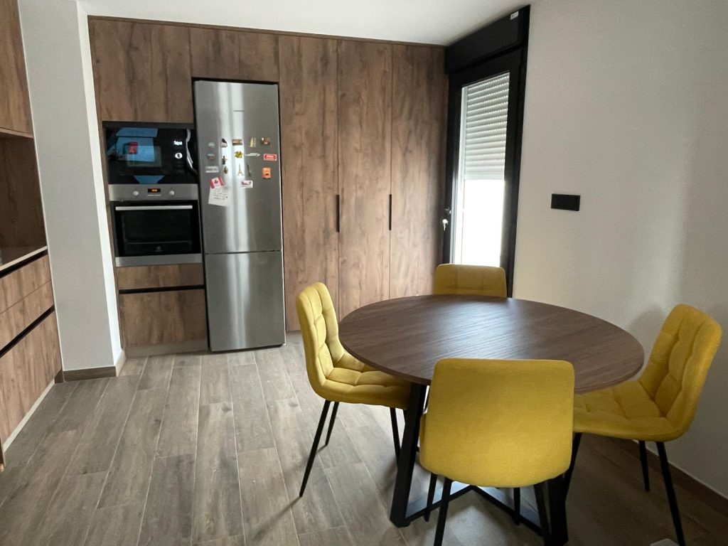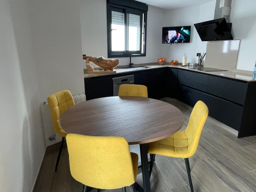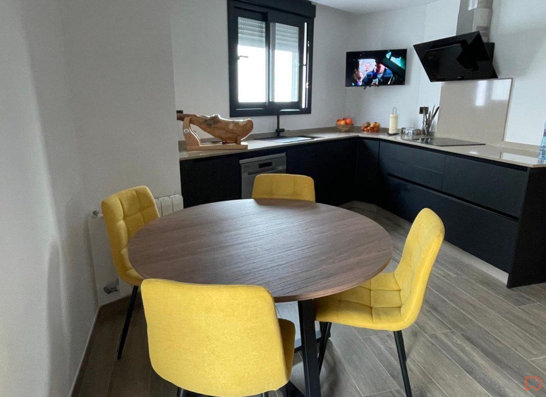 Conjunto de mesa redonda de madera con cuatro sillas tapizadas en color mostaza, de estilo moderno y funcional, ideal para comedor o cocina por su diseño cálido y contemporáneo.