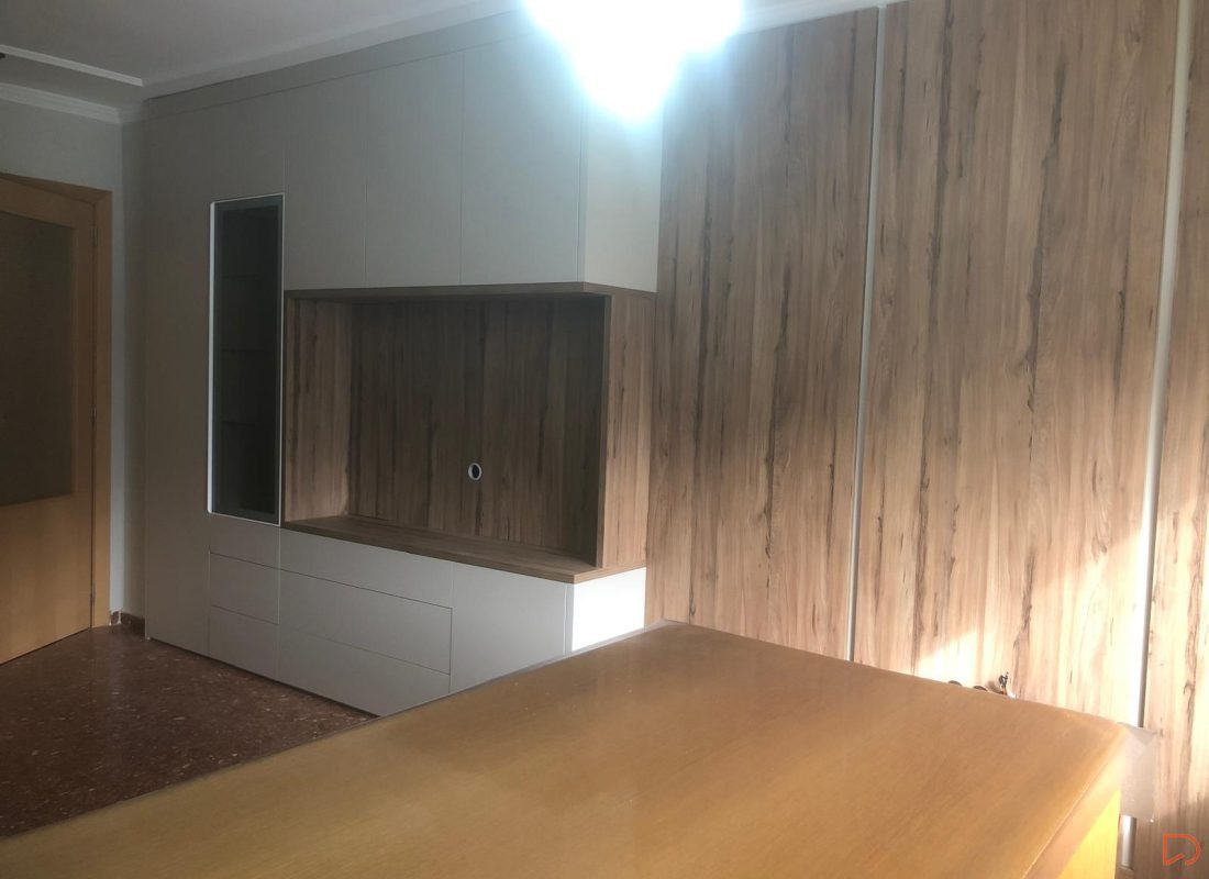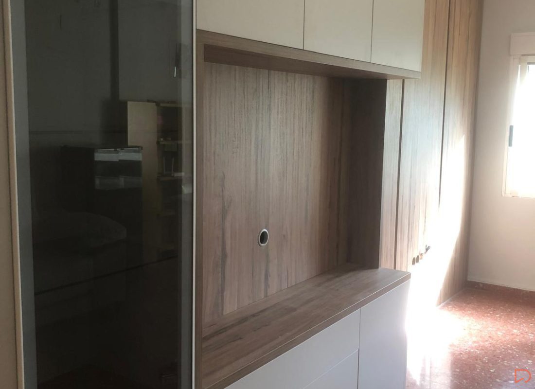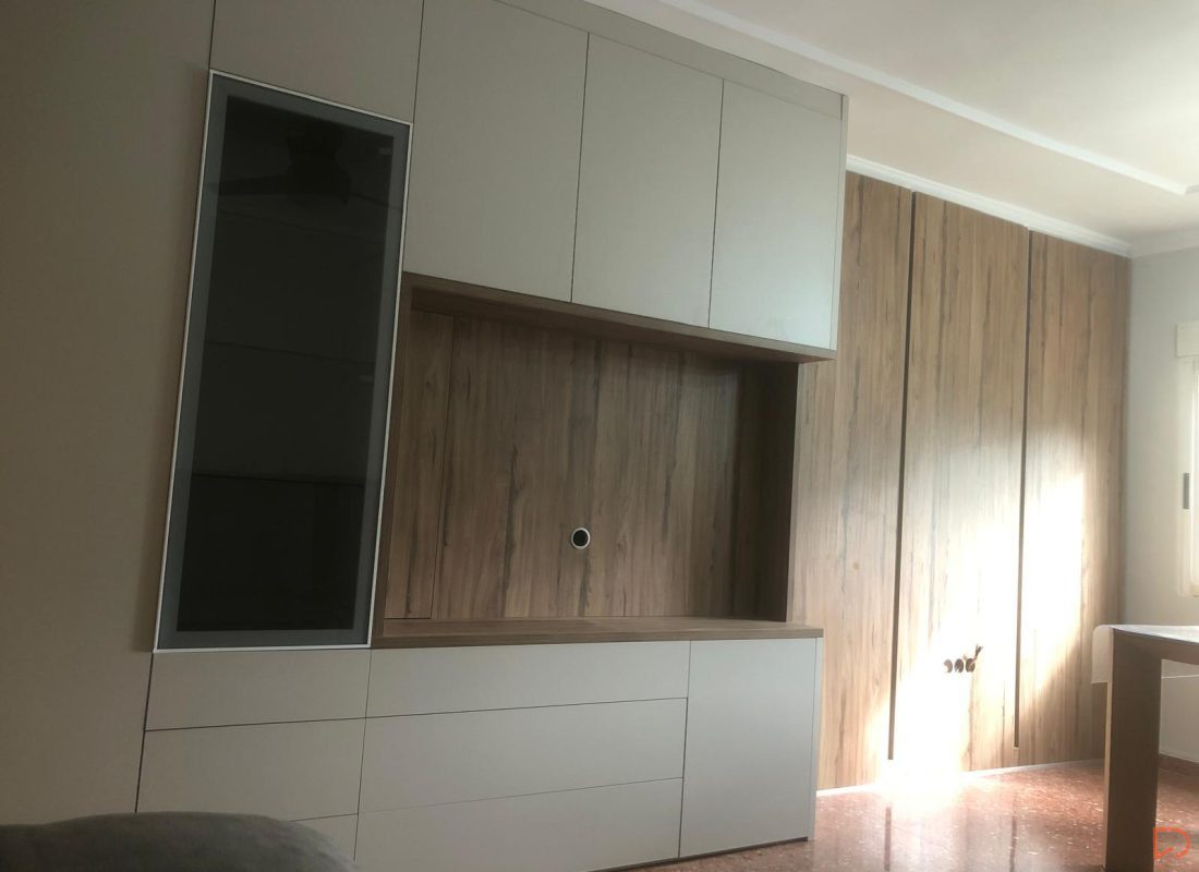 En este caso, necesitaban un mueble para el salón con vitrina, multifuncional a medida con el objetivo principal de poder almacenar, dejando un pequeño espacio en hueco para aportarle un toque de estética.