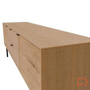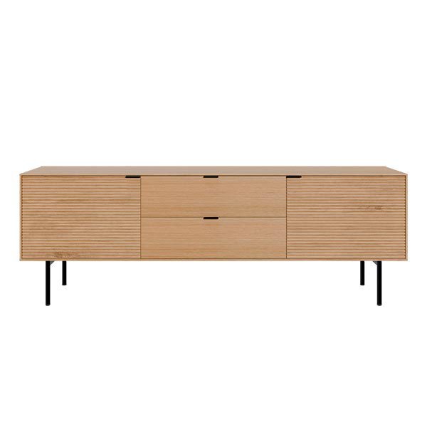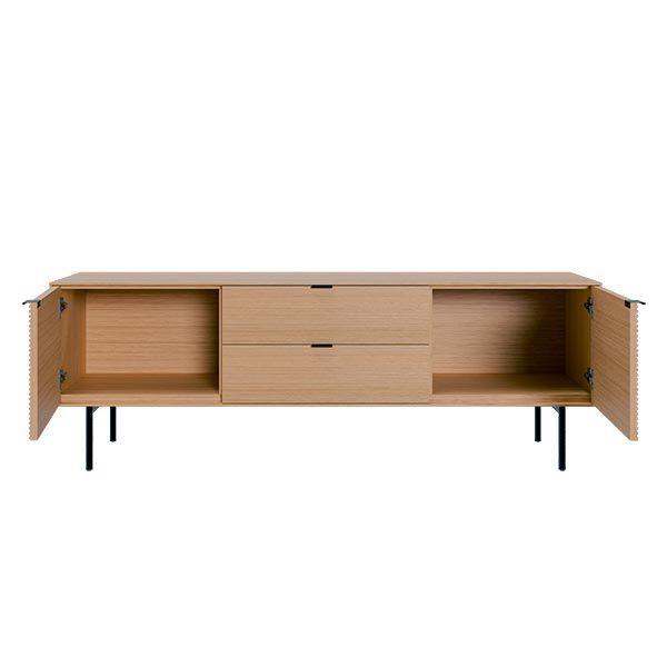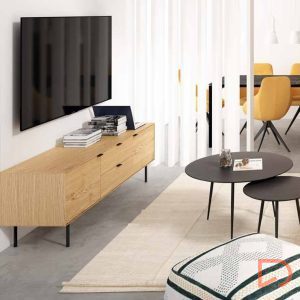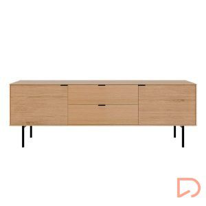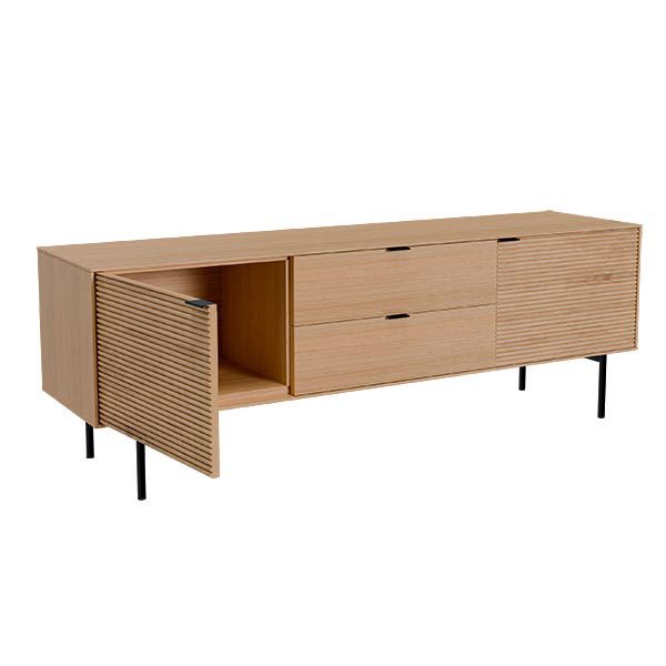 El mueble de TV TULSA de 160 cm es una pieza robusta y funcional que combina diseño natural con practicidad. Consta de dos puertas de madera y dos cajones, ofreciendo una excelente capacidad de almacenaje para mantener ordenados dispositivos, accesorios y otros elementos del salón.