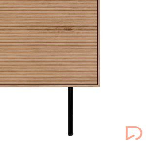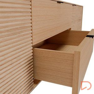 La estructura está realizada en chapa de roble natural, mientras que los frentes de cajones y puertas en madera maciza de roble rayado aportan textura y un acabado auténtico y elegante. El sistema soft closing y las guías metálicas ocultas aseguran una apertura suave y silenciosa.