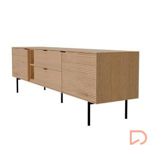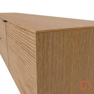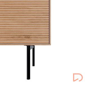 Su estructura está elaborada en chapa de roble, mientras que los frentes en madera maciza rayada elevan su presencia con una textura visualmente atractiva. Las patas metálicas en negro y los tiradores a juego refuerzan su carácter moderno, mientras que las guías metálicas ocultas y el sistema soft closing garantizan una experiencia de uso suave y silenciosa. Ideal para salones que buscan diseño con alma práctica.