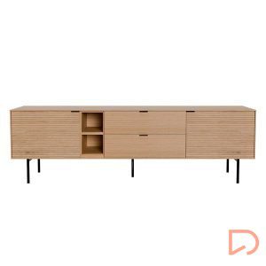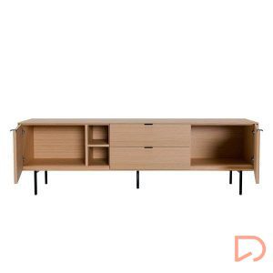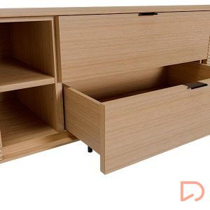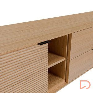 El mueble de TV TULSA de 180 cm combina diseño contemporáneo y calidez natural en una pieza funcional y estética. Con dos puertas laterales y dos cajones centrales, además de un hueco abierto, ofrece múltiples soluciones de almacenaje para mantener el orden sin sacrificar estilo.