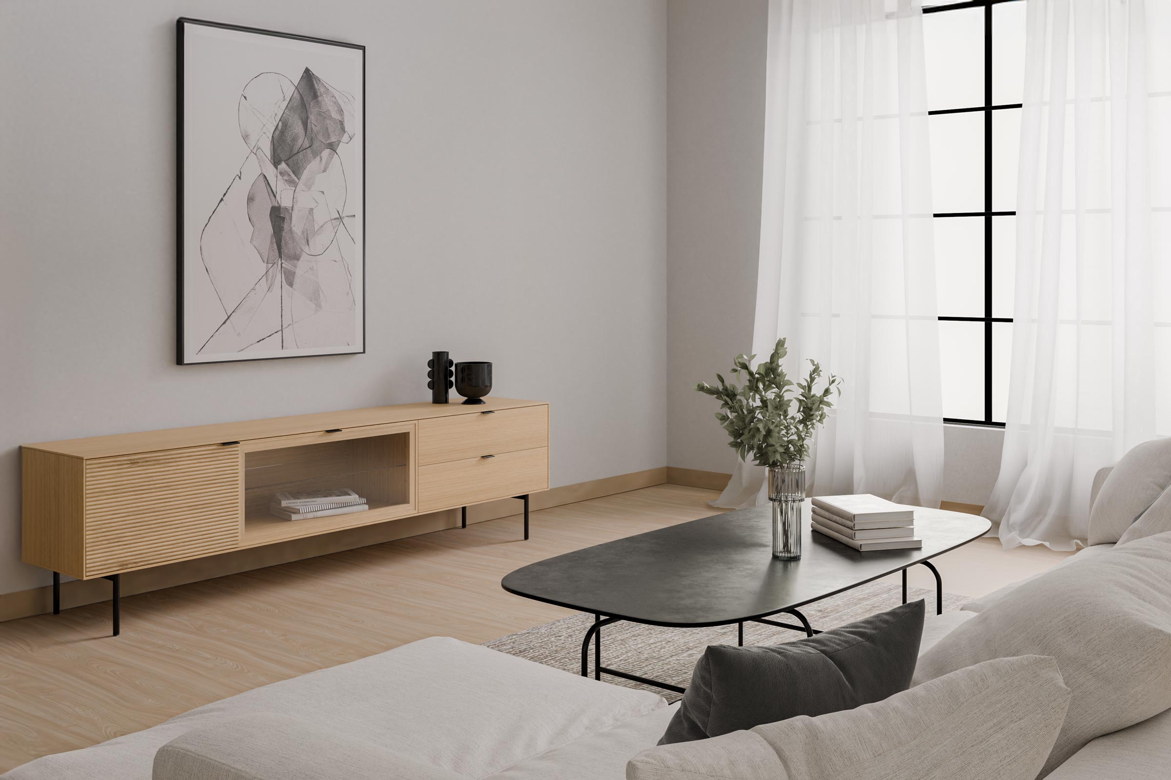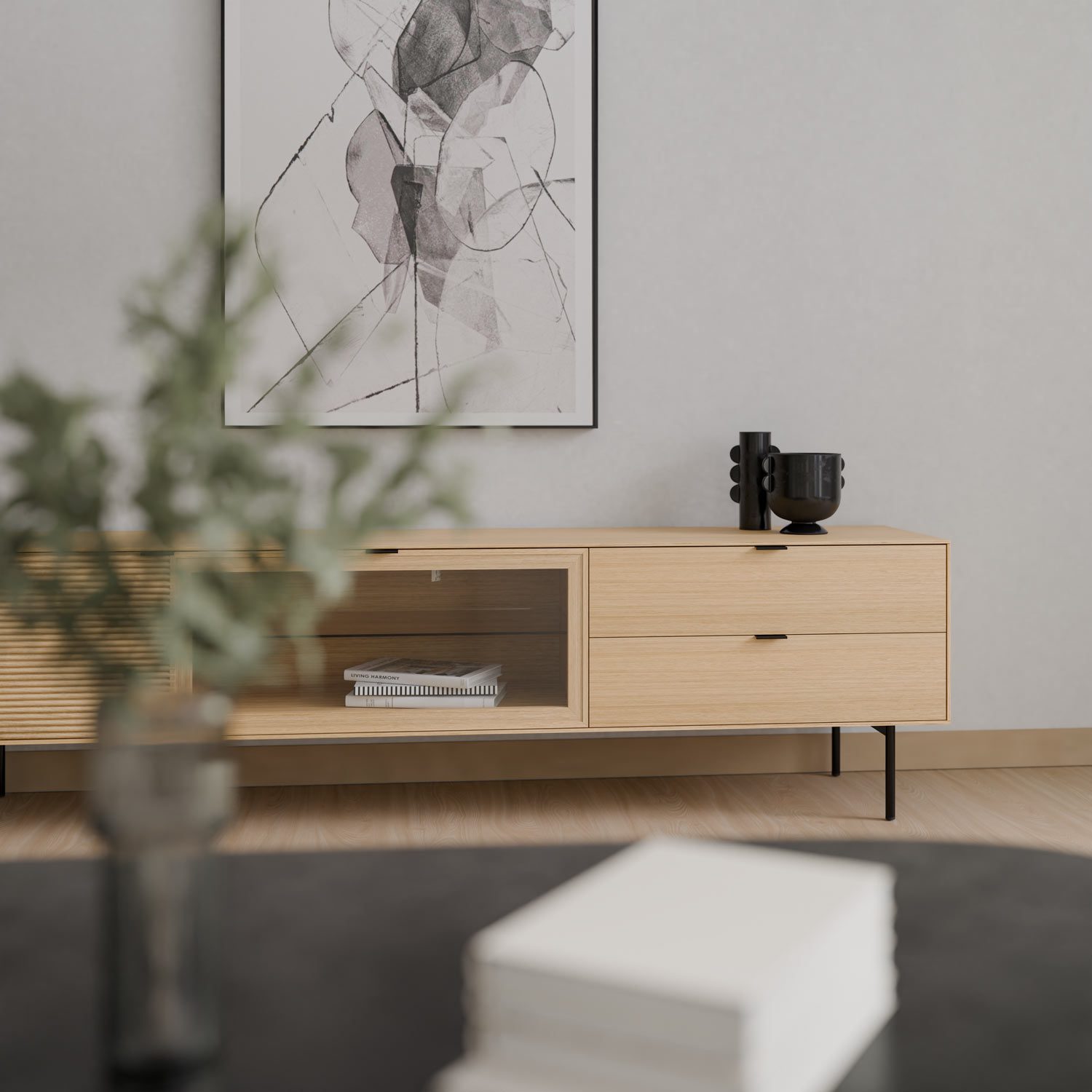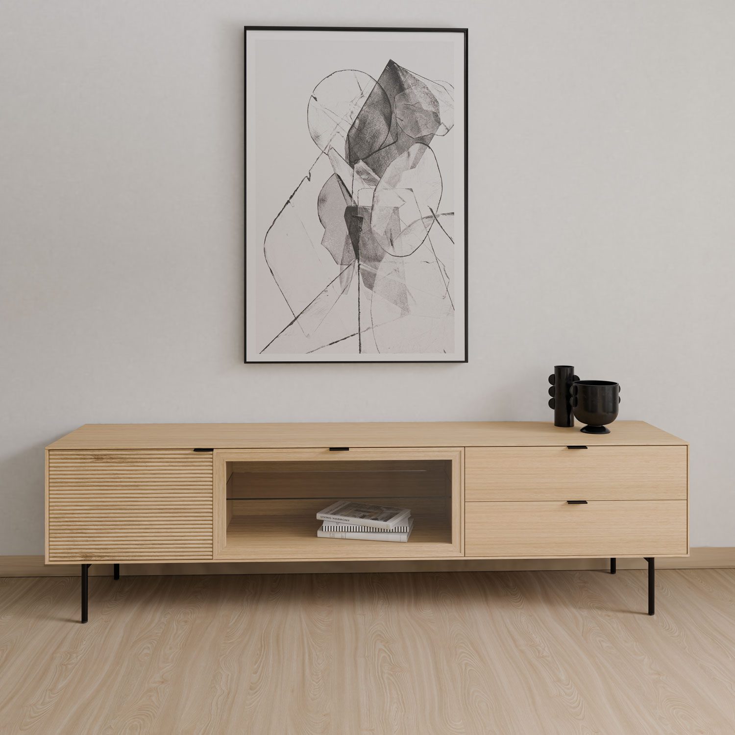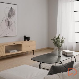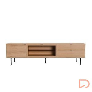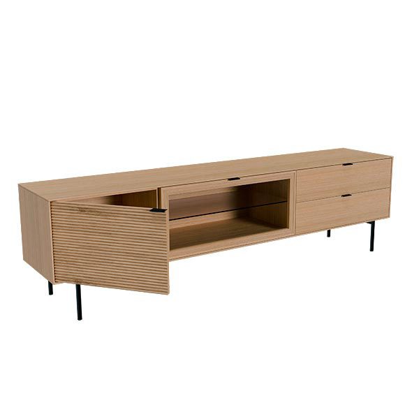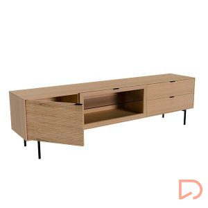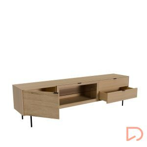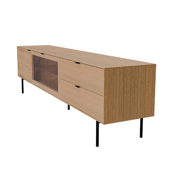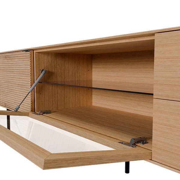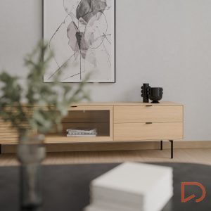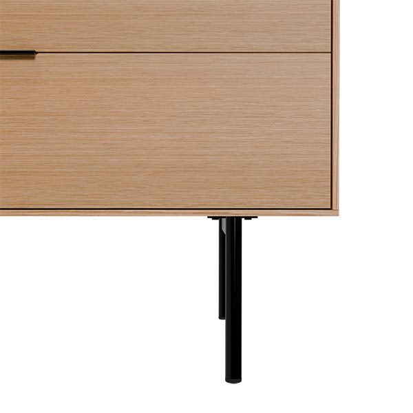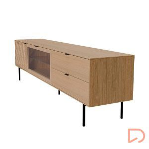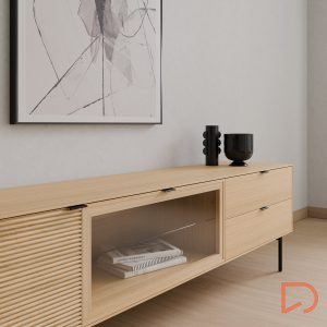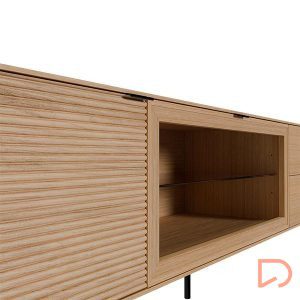 Fabricado con estructura en chapa de roble y frentes en madera maciza rayada, este modelo destaca por su textura natural y elegante. Las patas metálicas negras y los tiradores a juego aportan un contraste moderno, mientras que las guías ocultas y el sistema soft closing aseguran una apertura fluida y silenciosa. Ideal para salones contemporáneos que buscan un mueble de calidad con presencia y personalidad.