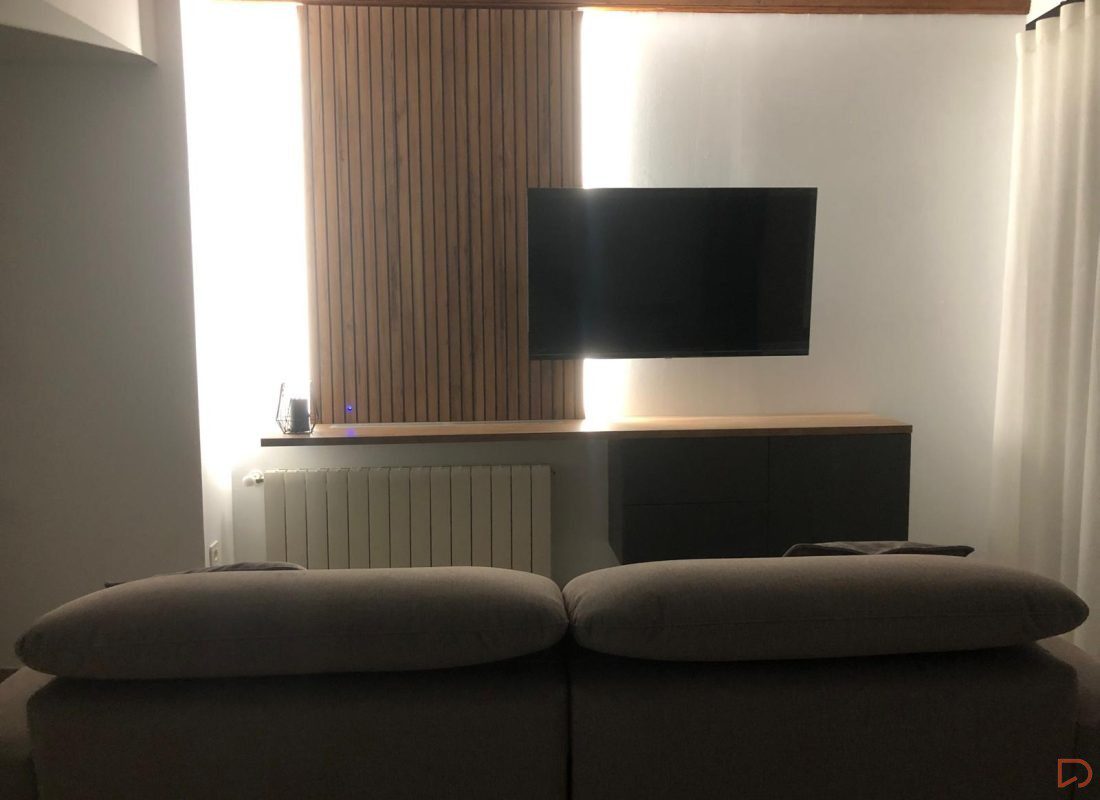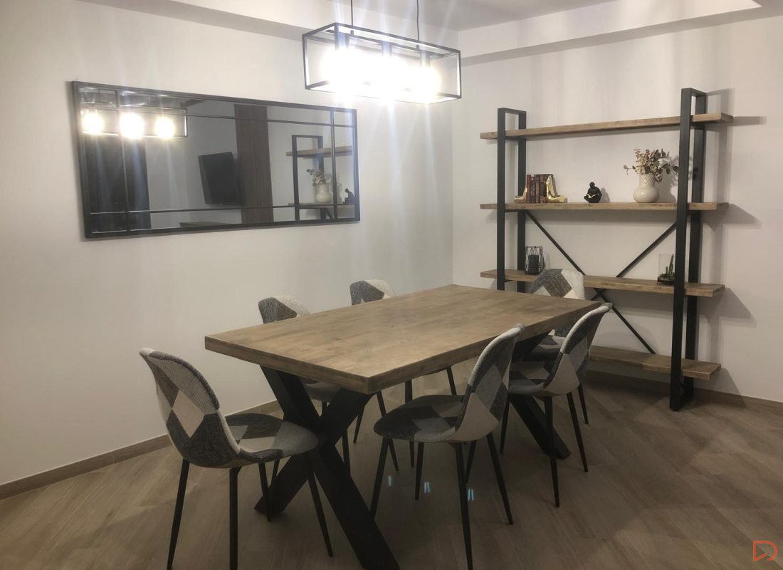 Donde se encuentra el salón, hemos integrado un mueble tv con acabados neutros y suaves, ya que la principal protagonista de este espacio es la palilleria, contrastando entre lo suave y lo extravagante. También se compone por un sofá en tonos grises, jugando con las luces y calidez del espacio. A su izquierda, encontramos la mesa de madera de roble con las patas en forma de ‘X’, con las sillas tapizadas con estampado, compensando la sencillez de la mesa, en el fondo de este ambiente, una estantería con los mismos acabados de la mesa.
