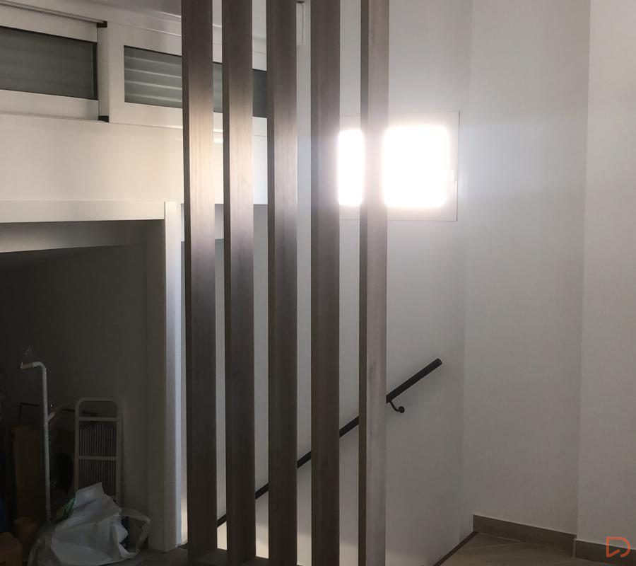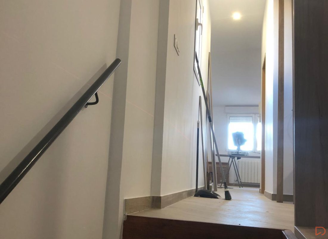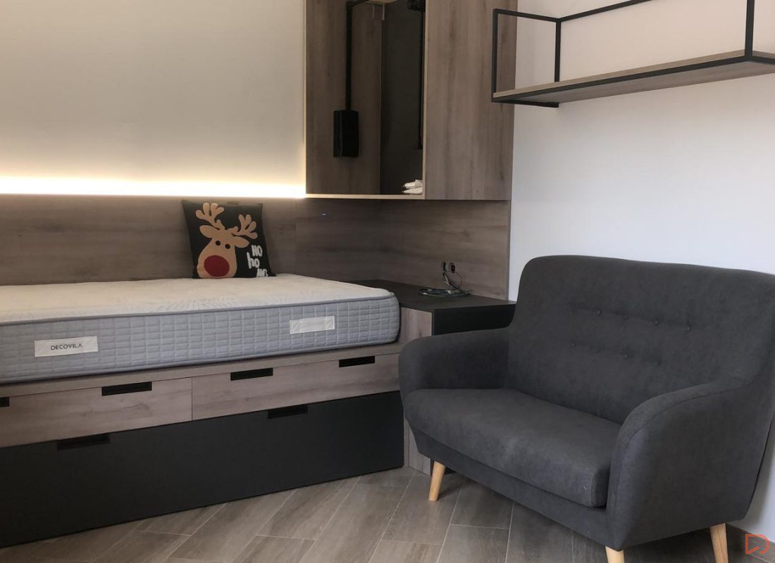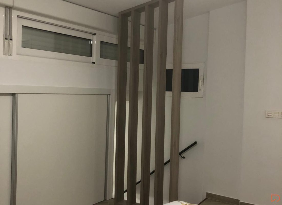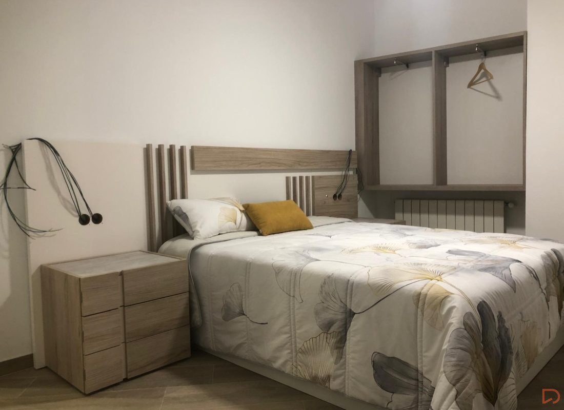 La otra parte de esta reforma se encuentra en el segundo piso, donde tenemos la habitación principal de matrimonio y la de invitados. La habitación de matrimonio se encuentra subiendo por las escaleras con un panel abuardillado en palillería, seguidamente encontramos la cama, con un conjunto de cabezal, mesitas y un armario auxiliar para las prendas de uso diario. En la habitación secundaria hemos diseñado una cama compacta, a conjunto de la cómoda y el armario que se encuentra en la parte superior de la cama que junto con la butaca, ha creado un espacio industrial-nórdico muy acogedor.