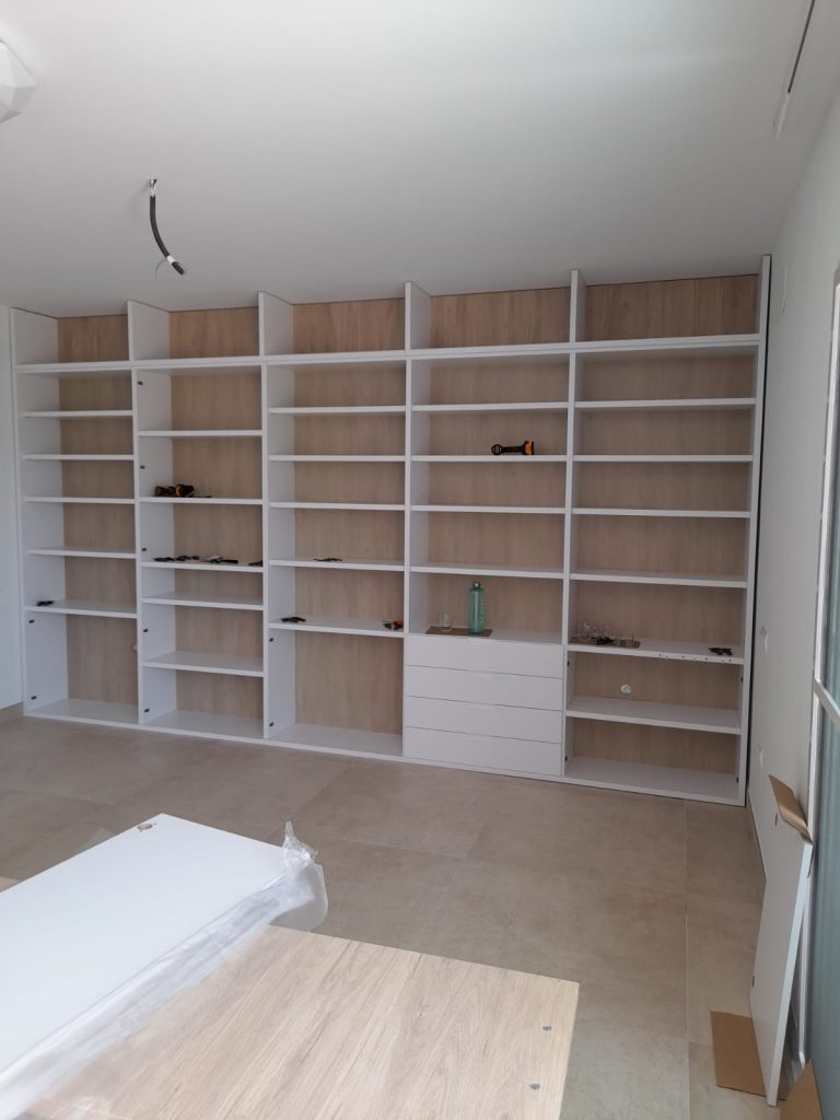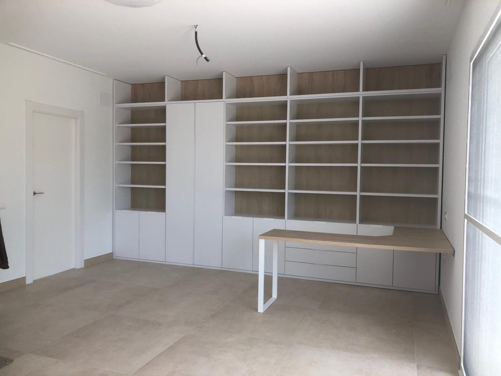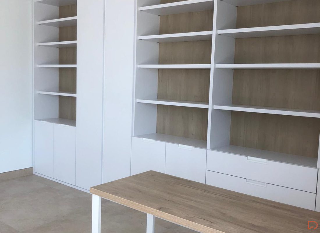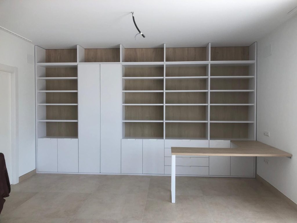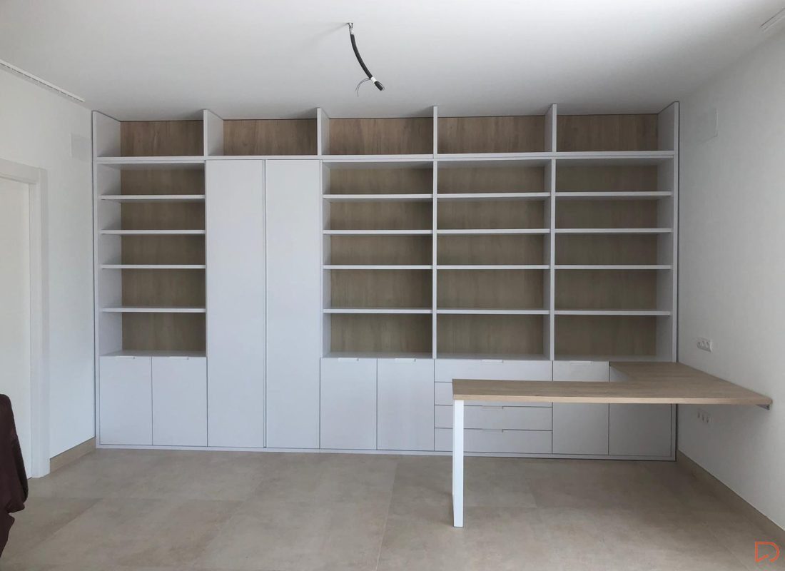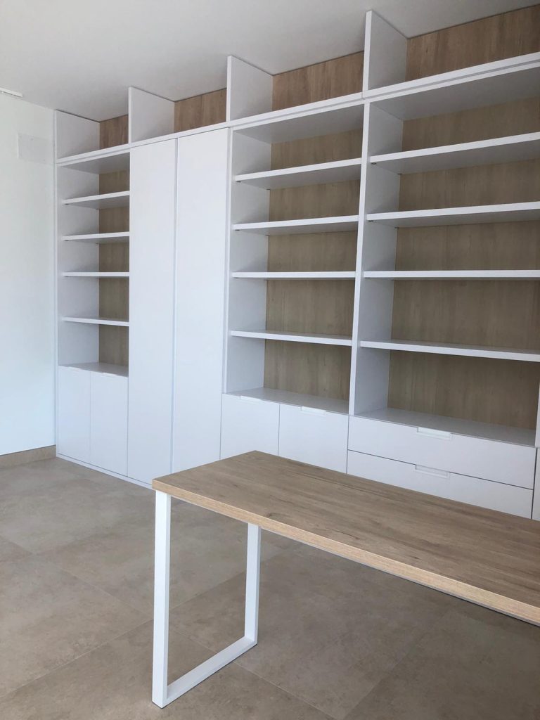 Medimos toda la pared y diseñamos una estantería con 5 cuerpos con el techo visto, utilizando un tono roble natural la trasera y mesa aportando calidez, haciendo así destacar los cantos en blanco de 3cm. de espesor de los estantes y divisores.