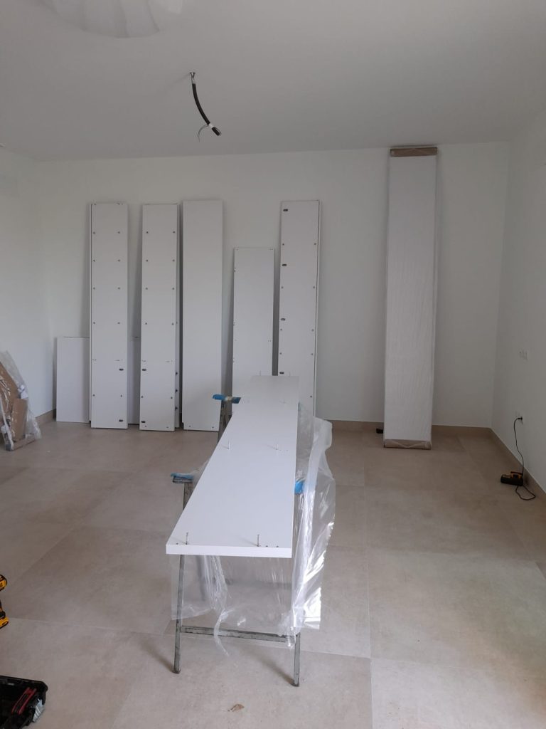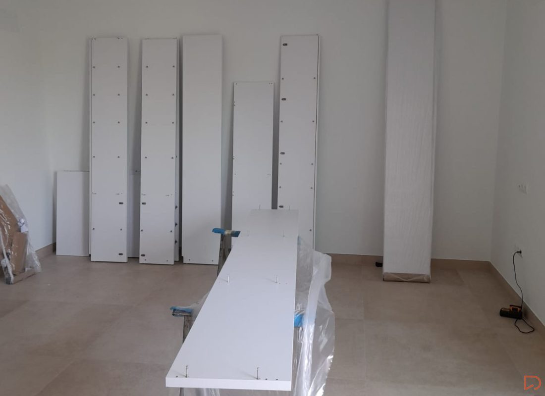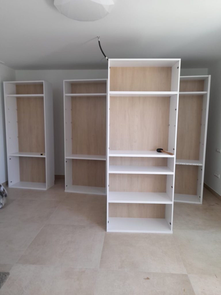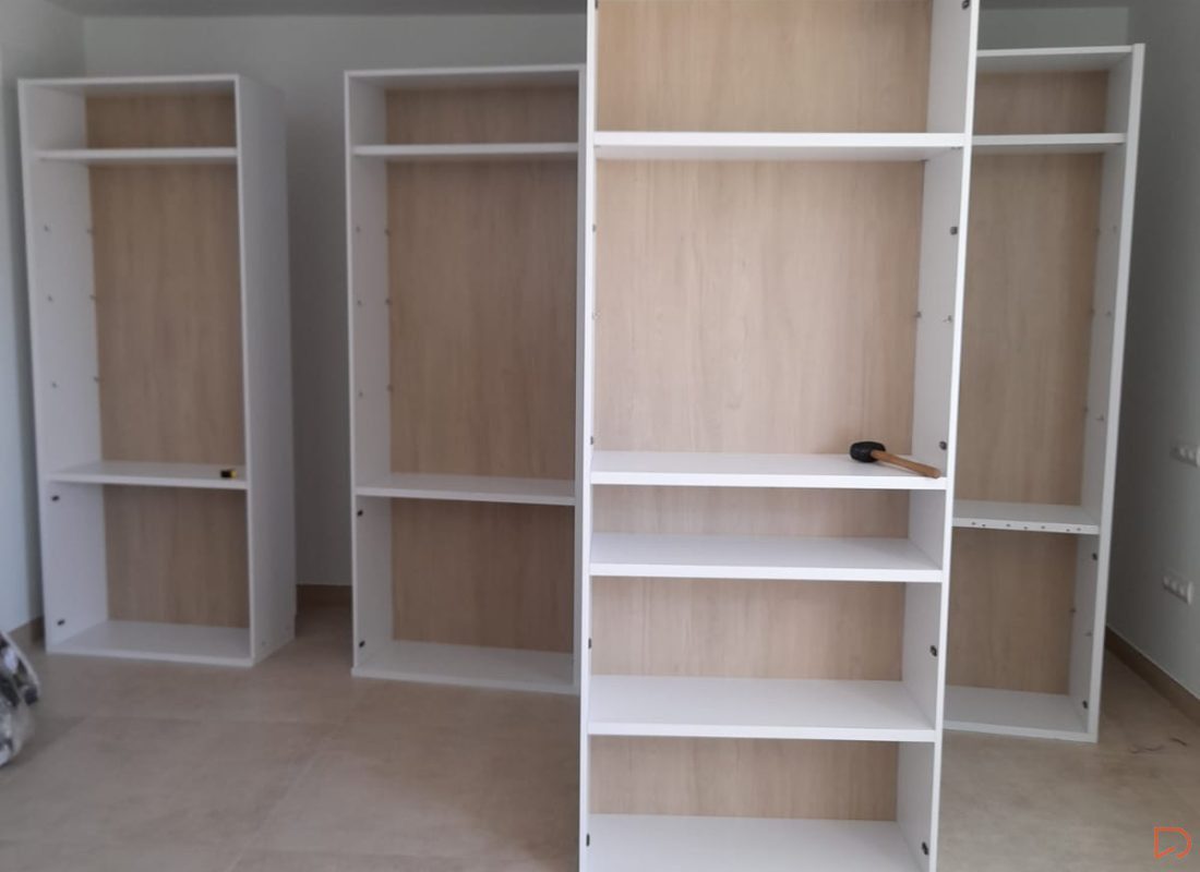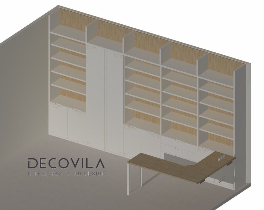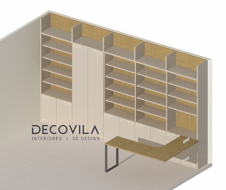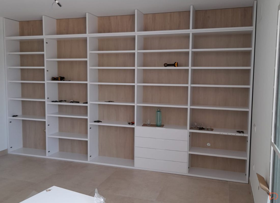 Medimos toda la pared y diseñamos una estantería con 5 cuerpos con el techo visto, utilizando un tono roble natural la trasera y mesa aportando calidez, haciendo así destacar los cantos en blanco de 3cm. de espesor de los estantes y divisores.