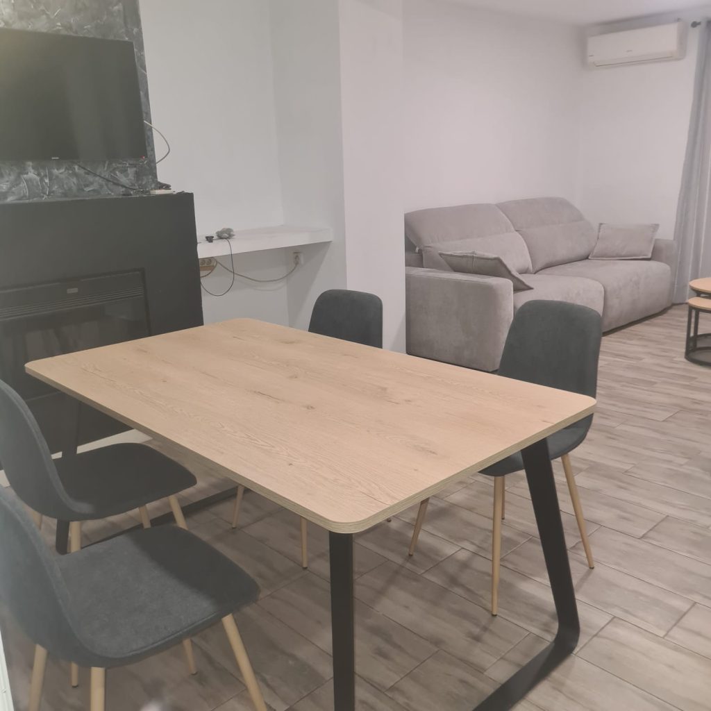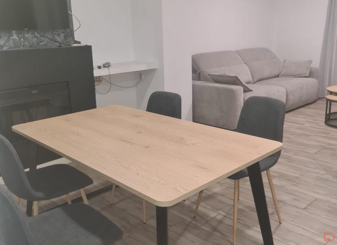 En la zona de comedor, una mesa rectangular de madera clara con patas metálicas negras se complementa con sillas tapizadas en gris oscuro y patas de madera clara, manteniendo la coherencia cromática. El suelo imitación madera y las cortinas ligeras en gris aportan calidez y un ambiente acogedor al espacio.