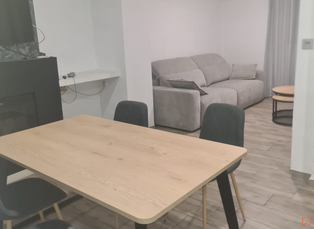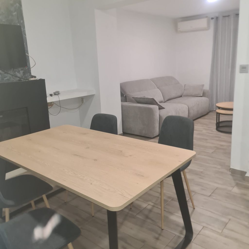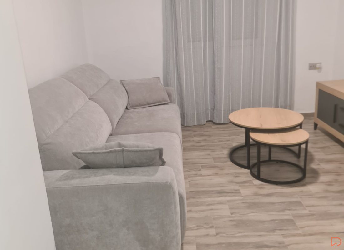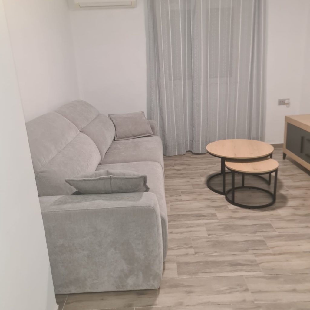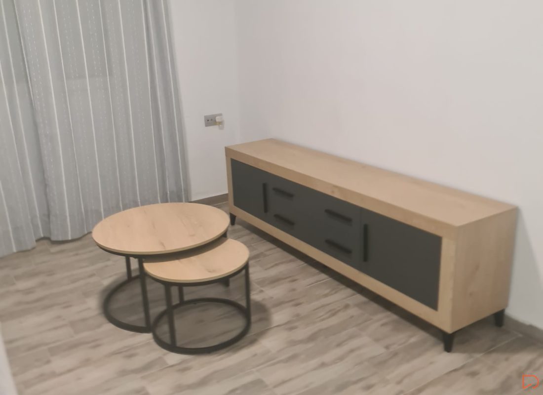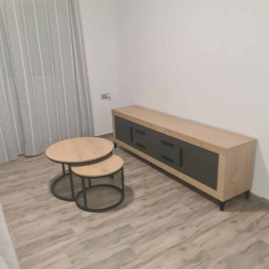 Este amueblamiento combina comodidad y funcionalidad con un estilo moderno y minimalista. El salón cuenta con un sofá en tono gris claro de líneas rectas y cojines a juego, acompañado por un conjunto de mesas nido redondas con tablero en imitación madera natural y base metálica negra.
