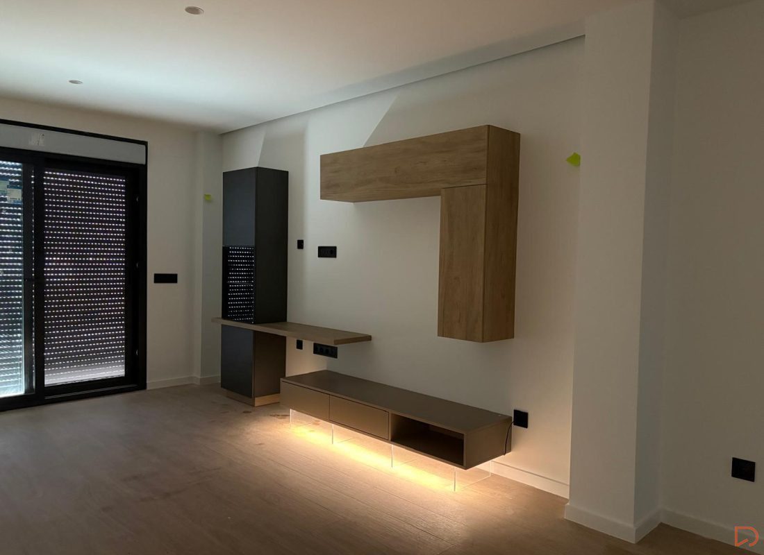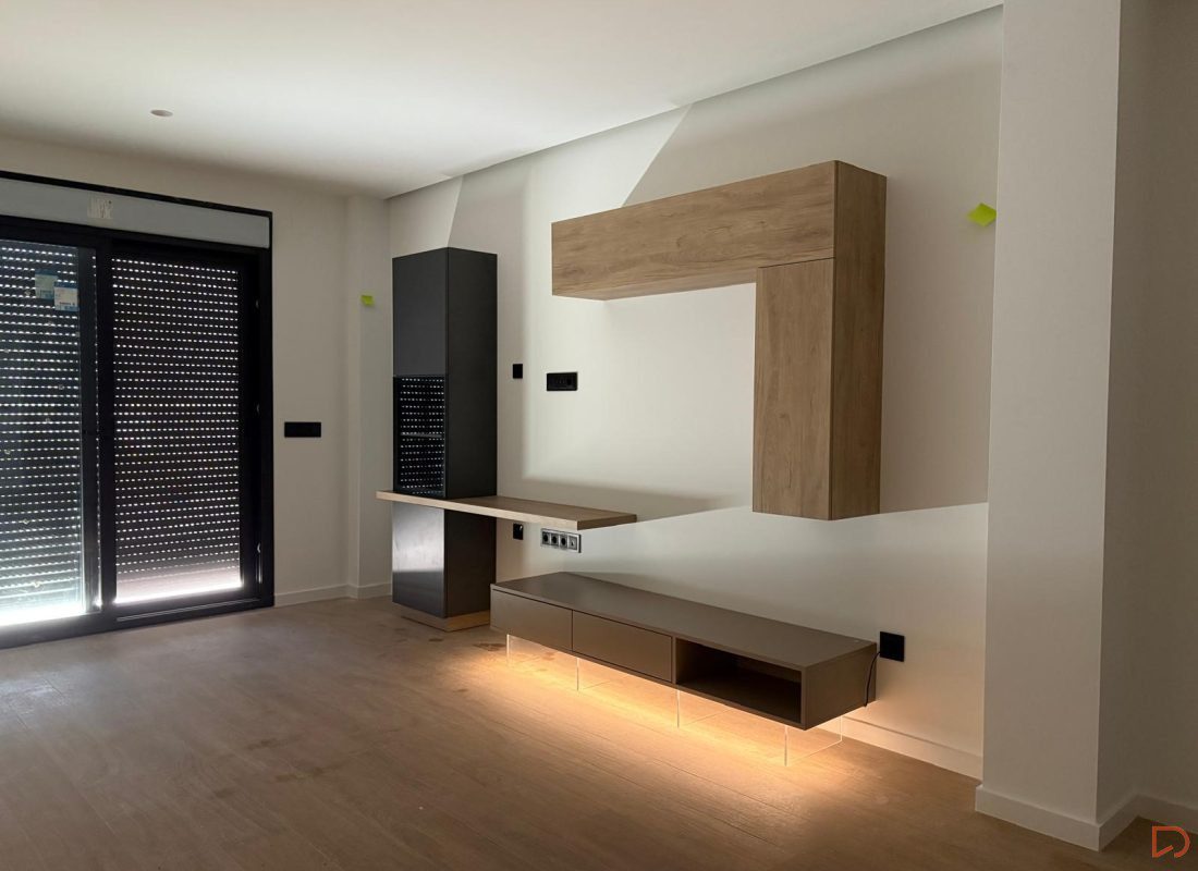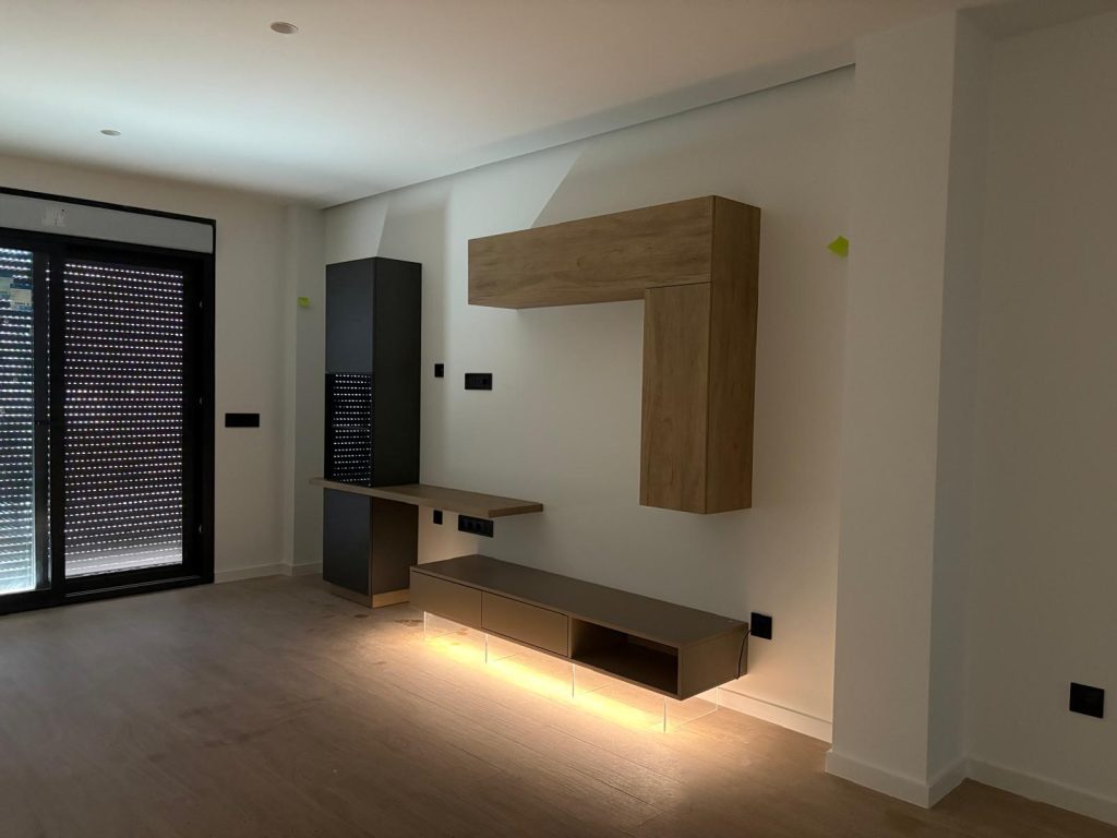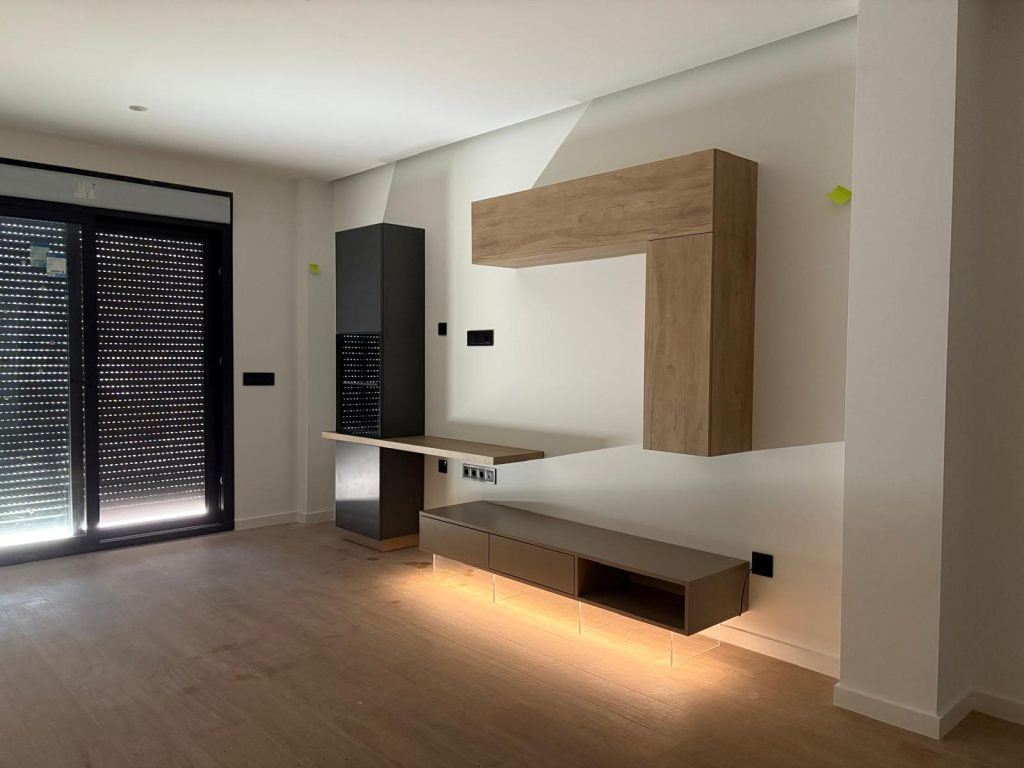 Conjunto de mueble de salón moderno con módulos suspendidos y aparador bajo en tonos madera y neutros, de diseño minimalista y elegante, con patas con iluminación LED integrada que aportan un efecto decorativo y contemporáneo.
