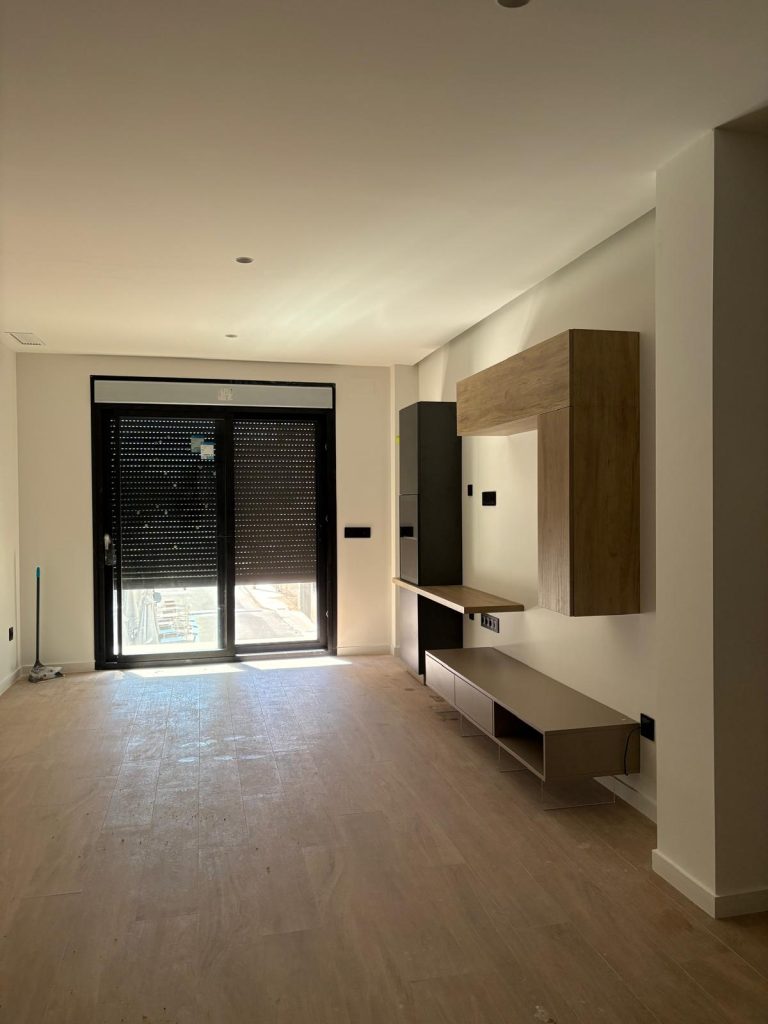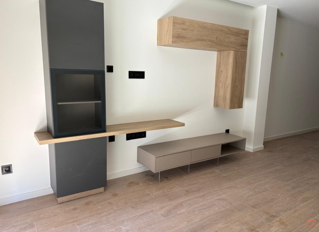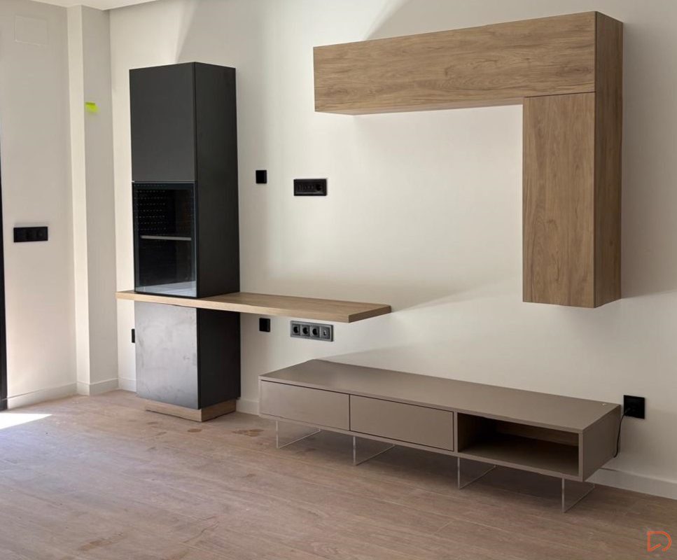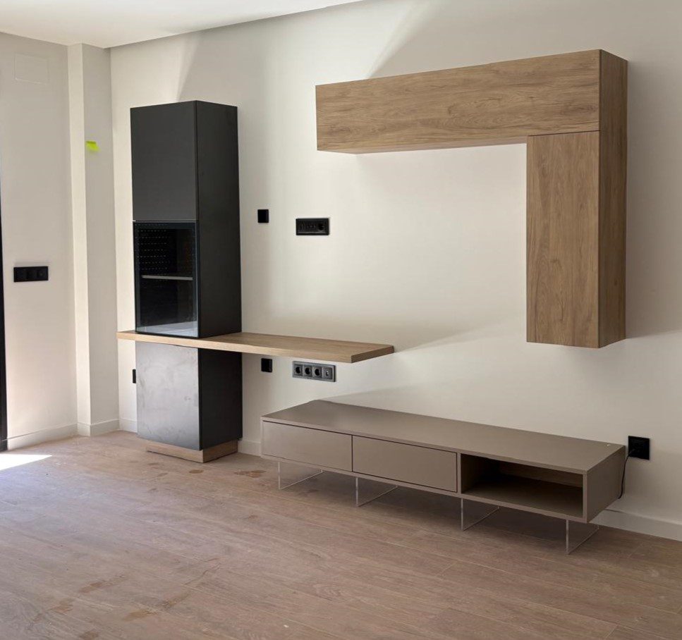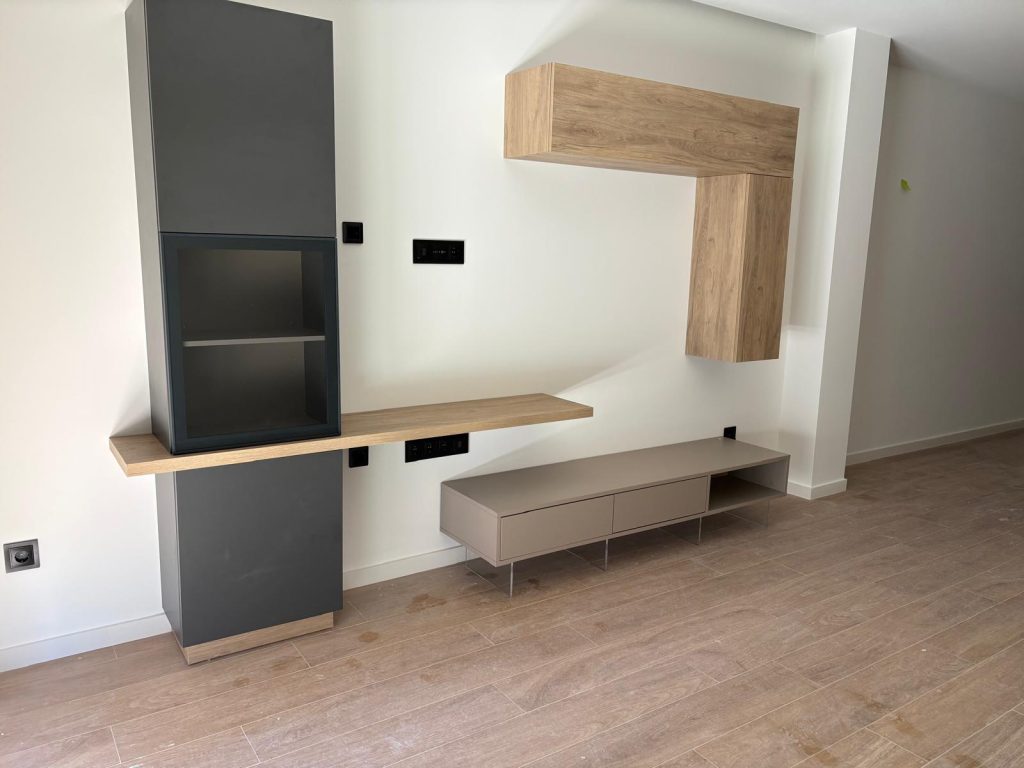 Conjunto de mueble de salón moderno con módulos suspendidos y aparador bajo en tonos madera y neutros, de diseño minimalista y elegante, con patas con iluminación LED integrada que aportan un efecto decorativo y contemporáneo.