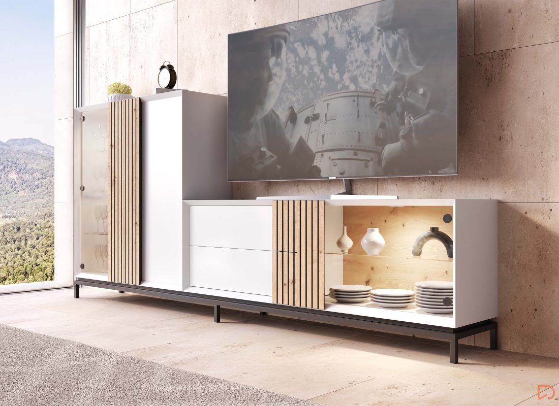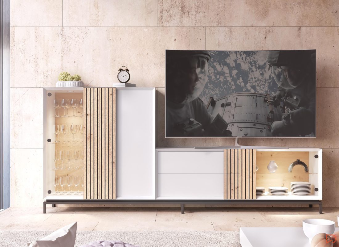 - Original mueble salón moderno blanco Natura con elegantes detalles en color madera natural amazonas.