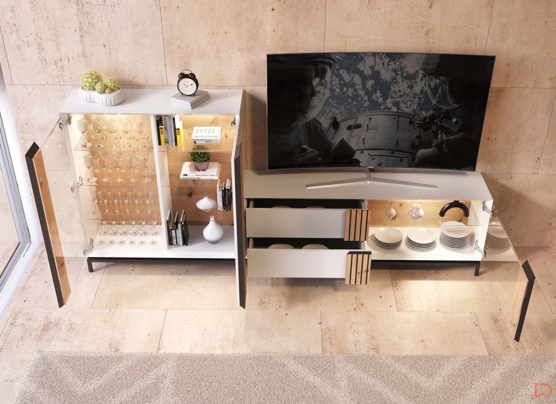 - Dispone de mueble TV 150 o 180 a elegir, que siguen la misma linea decorativa y vajillero de 120 cm con medidas entre 270 cm y 300 cm de largo
