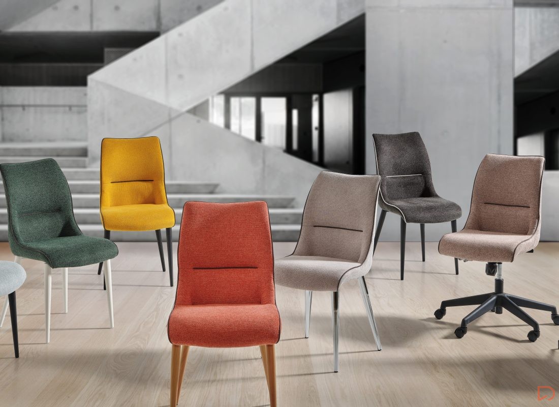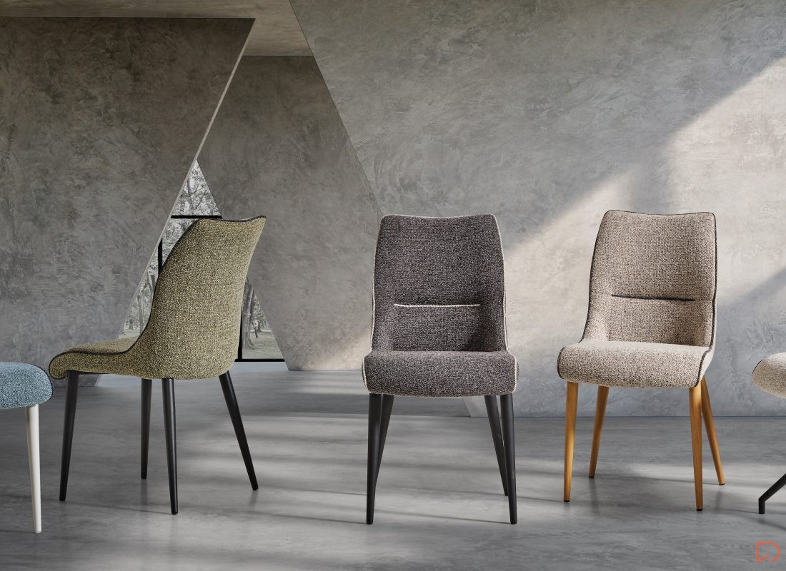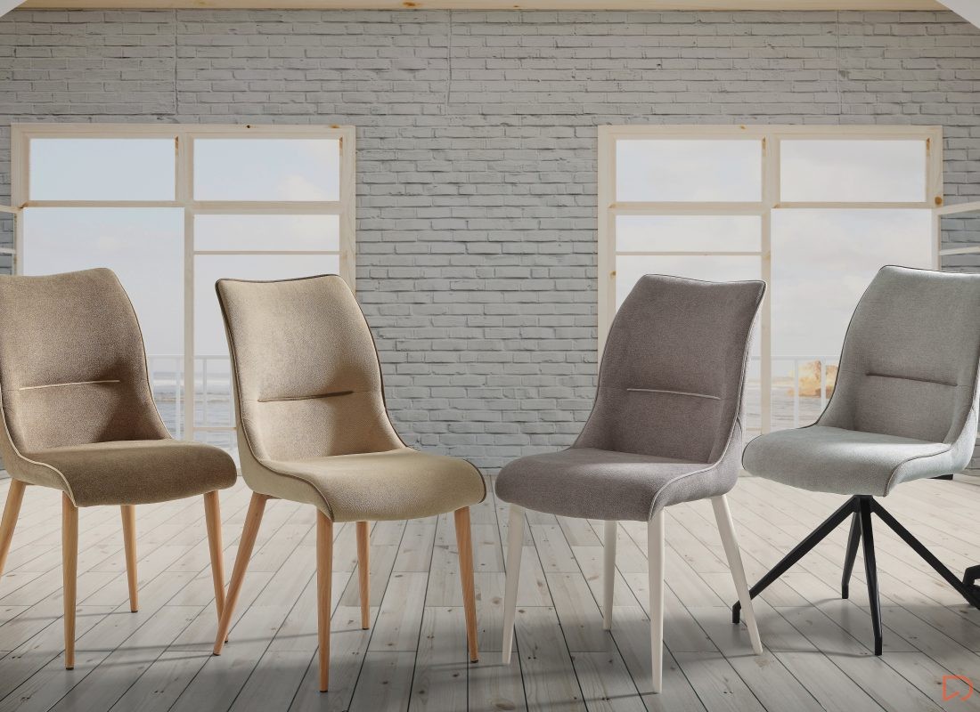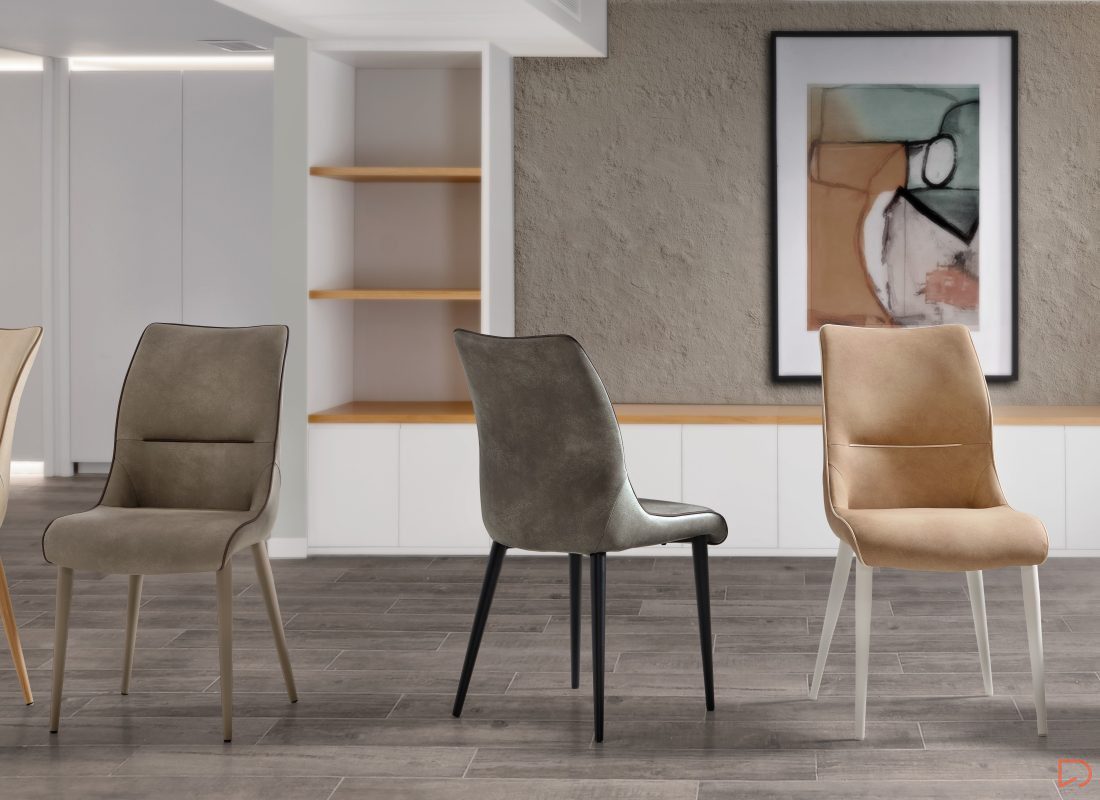 - La silla BEA combina su asiento y respaldo tapizados en un tejido texturizado o similar a la piel en diferentes tejidos.