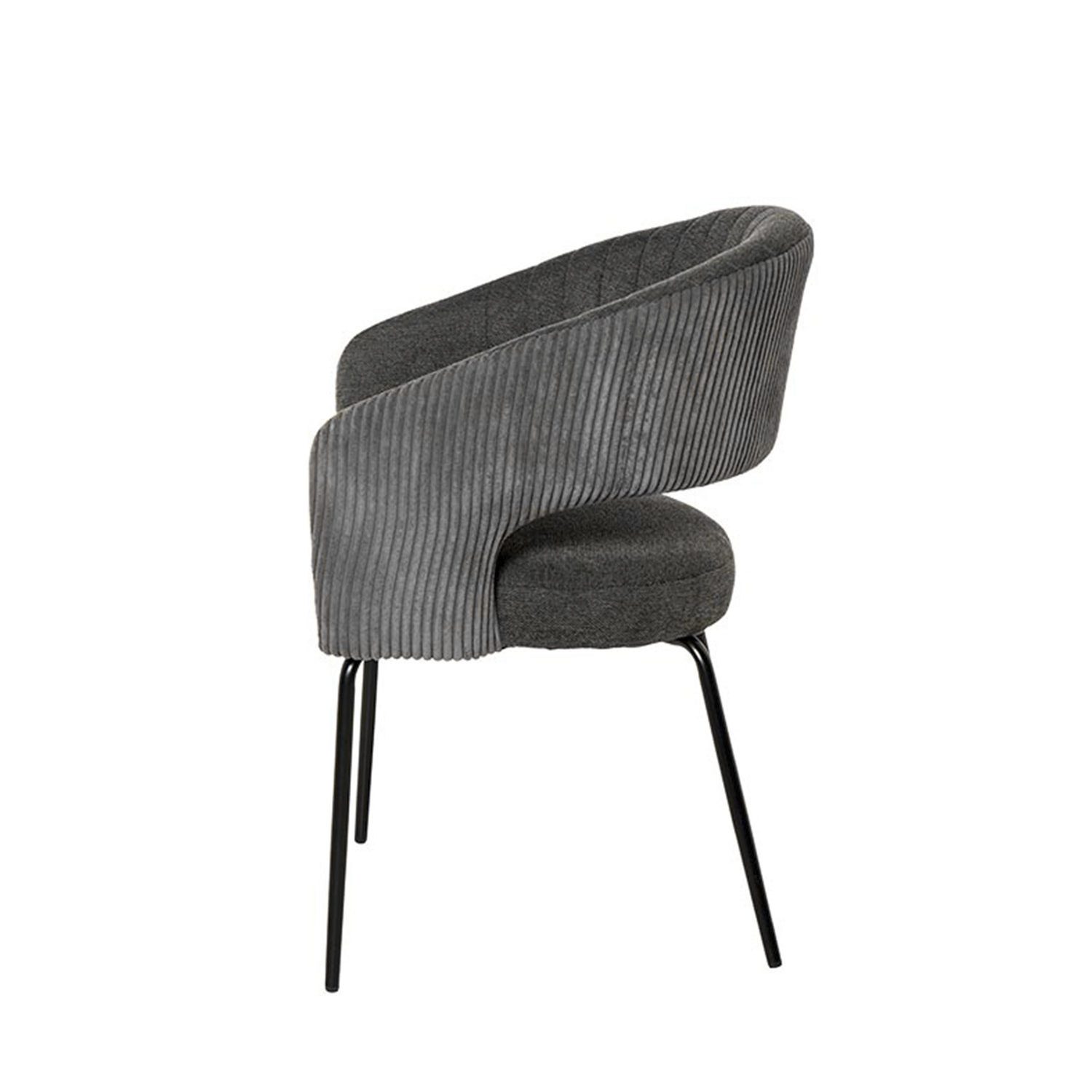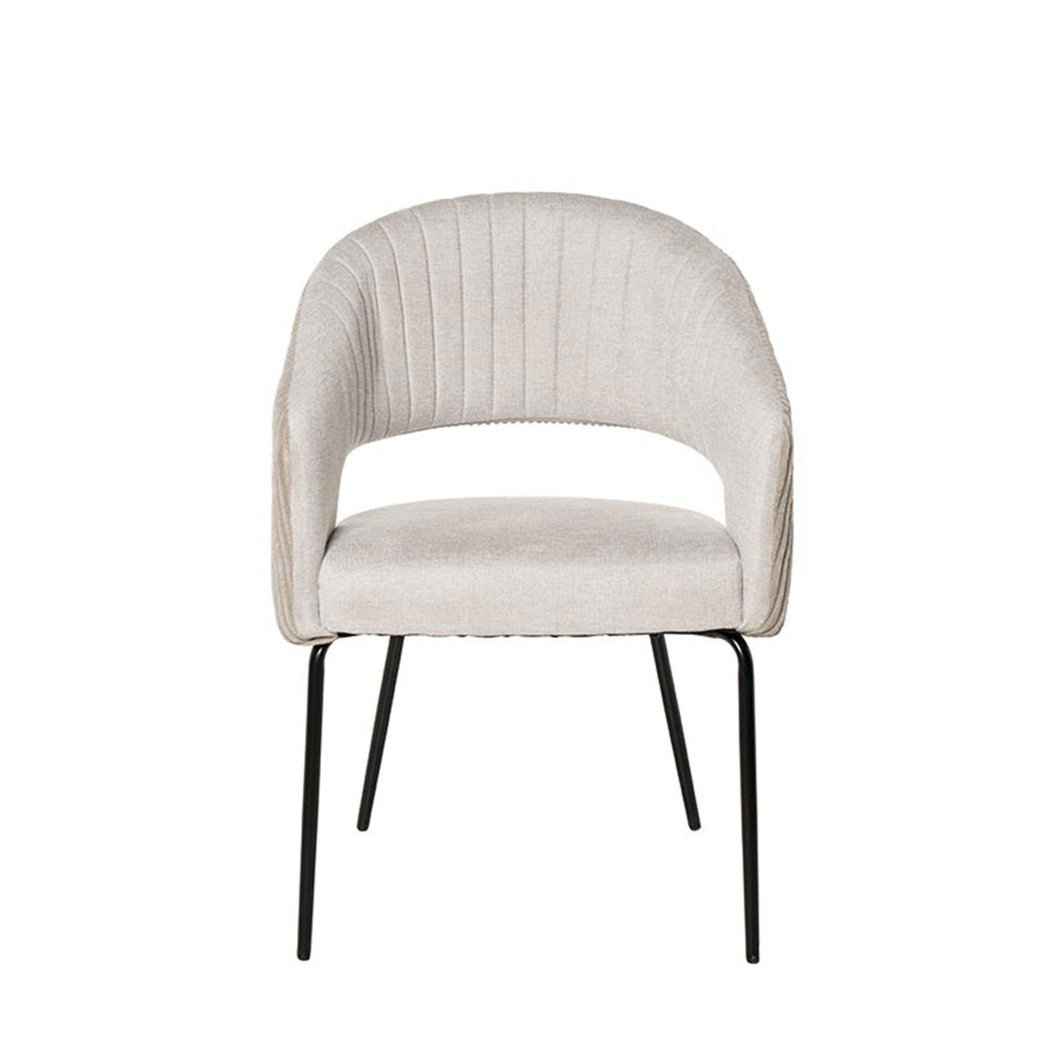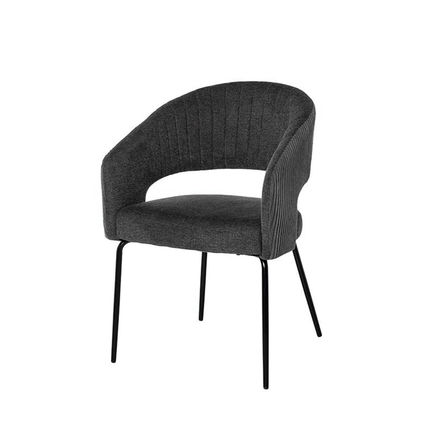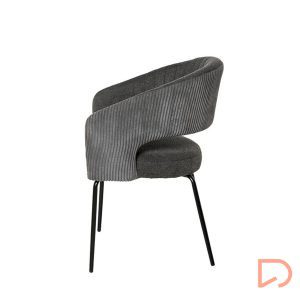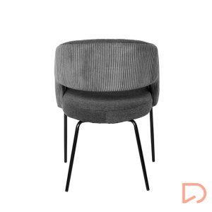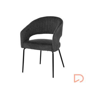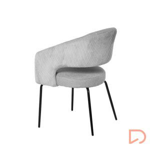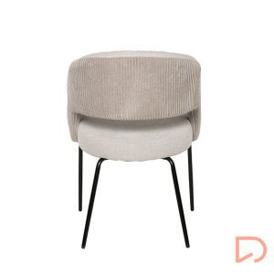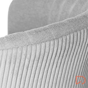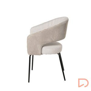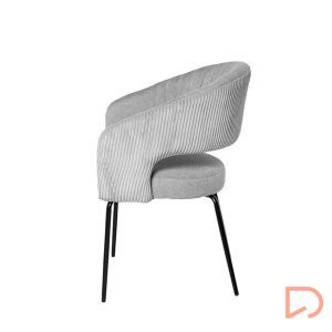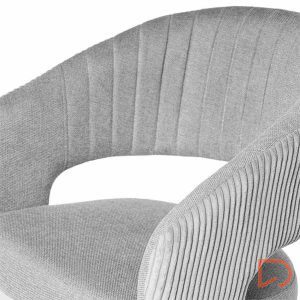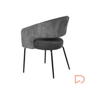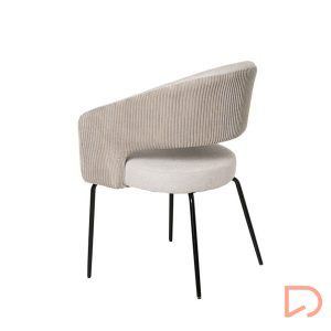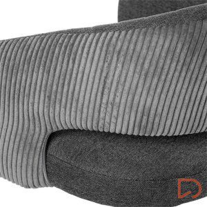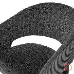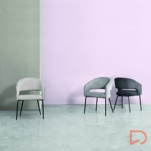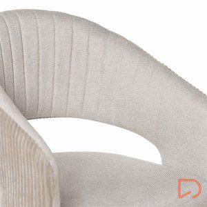 La silla ELEONOR es una pieza única que destaca por su combinación de dos tipos de tejido: la parte delantera está tapizada en un tejido liso y elegante, mientras que la parte trasera del respaldo y los reposabrazos presenta un tacto aterciopelado, aportando una textura suave.