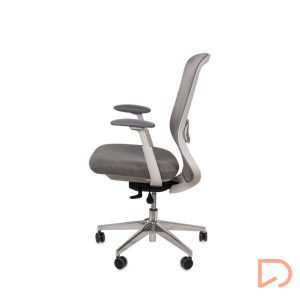 El tapizado del asiento y el apoyo lumbar presentan un acabado uniforme que aporta un toque sofisticado, armonizando perfectamente con los tonos grises y metálicos de su estructura.